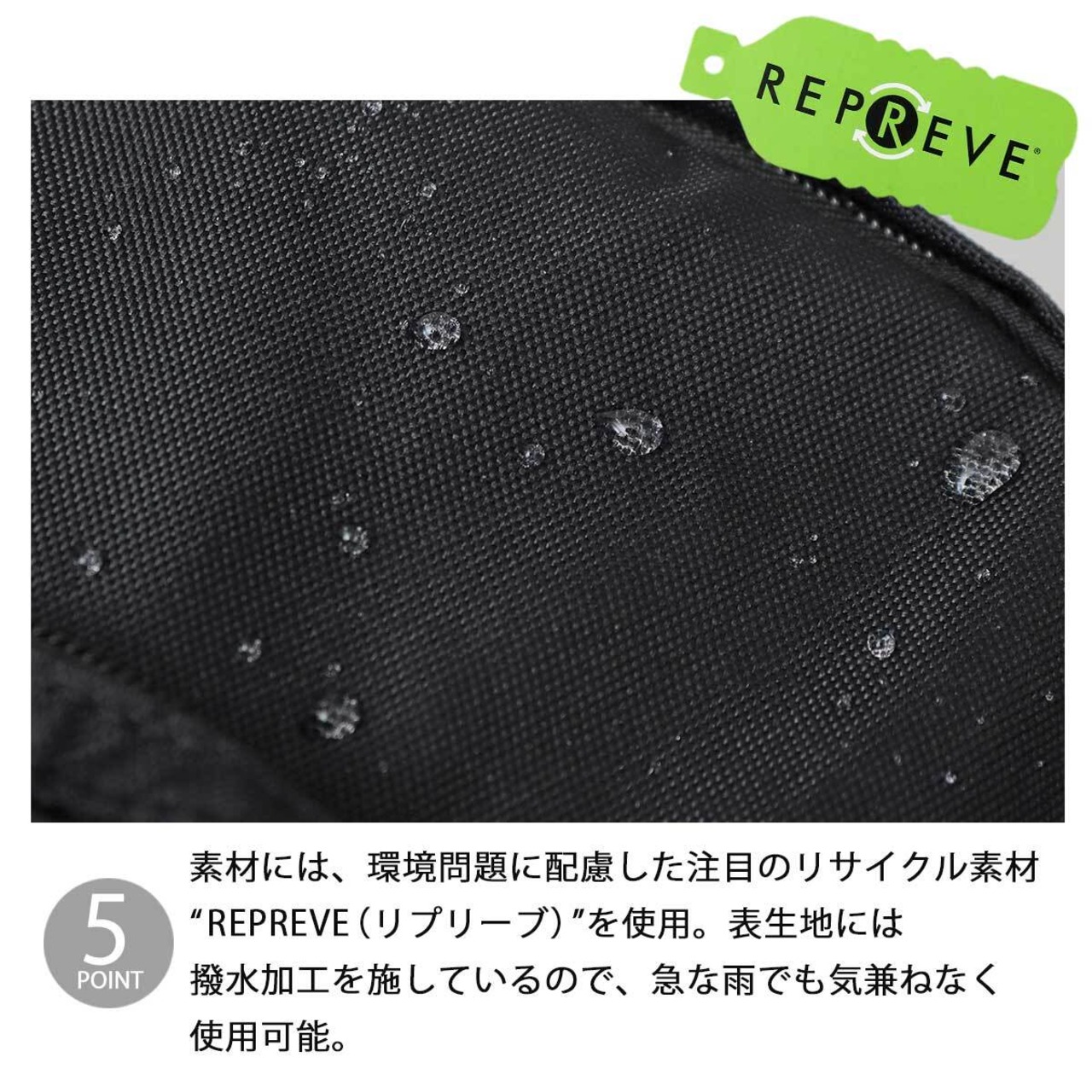素材には、環境問題に配慮した注目のリサイクル素材“REPREVE(リプリーブ)”を使用。表生地には撥水加工を施しているので、急な雨でも気兼ねなく使用可能。