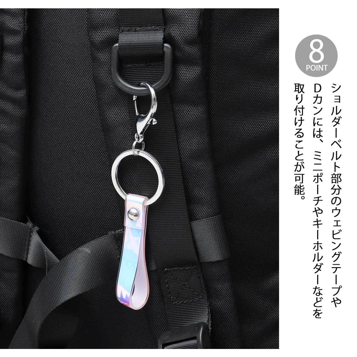 ショルダーベルト部分のウェビングテープやDカンには、ミニポーチやキーホルダーなどを取り付けることが可能。