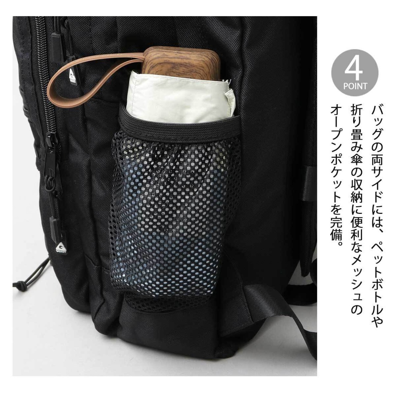 バッグの両サイドには、ペットボトルや折り畳み傘の収納に便利なメッシュのオープンポケットを完備。