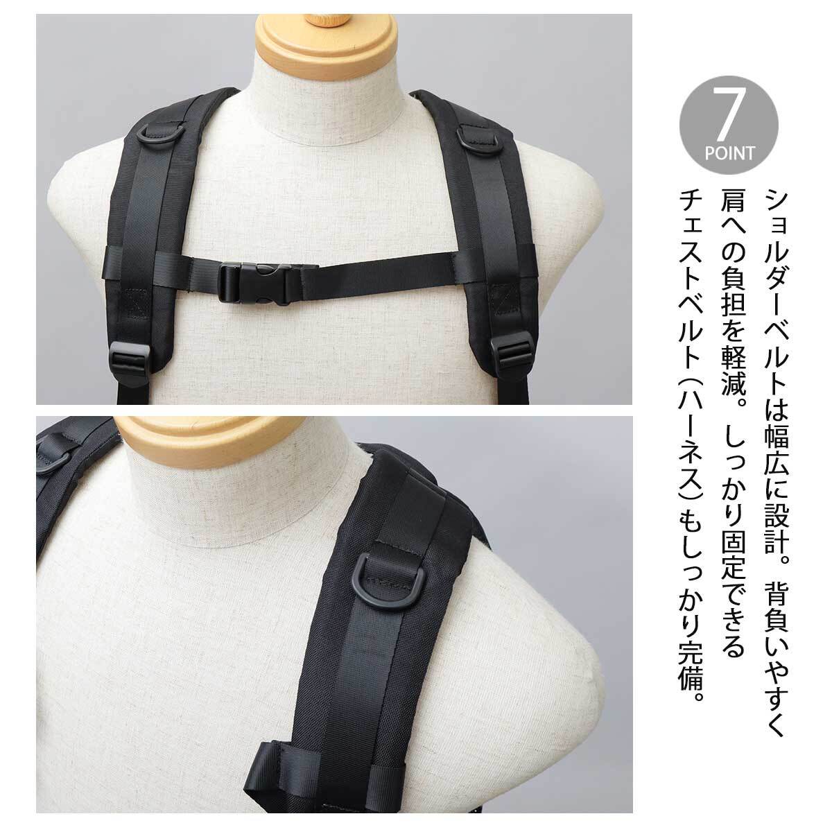 ショルダーベルトは幅広に設計。背負いやすく、肩への負担を軽減。しっかり固定できるチェストベルト(ハーネス)もしっかり完備。