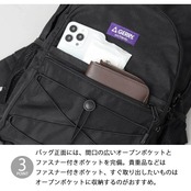 ドローコードやメッシュポケット、ファスナーの引手などアウトドアな機能が備わっていて実用的です。3層式の収納スペースなので荷物の仕分けができて、ポケットも豊富なので、小物などもしっかり整理整頓できます。撥水加工されているので、デイリーユースはもちろん、通勤・通学でも活躍するスペックです。ユニセックスで使用できるのでプレゼント・ギフトにもおすすめ!