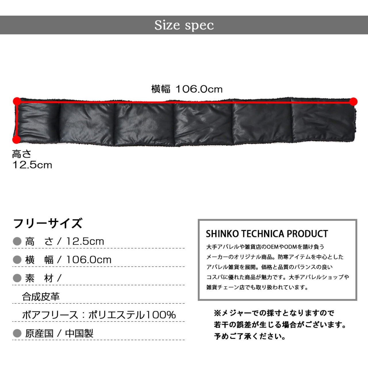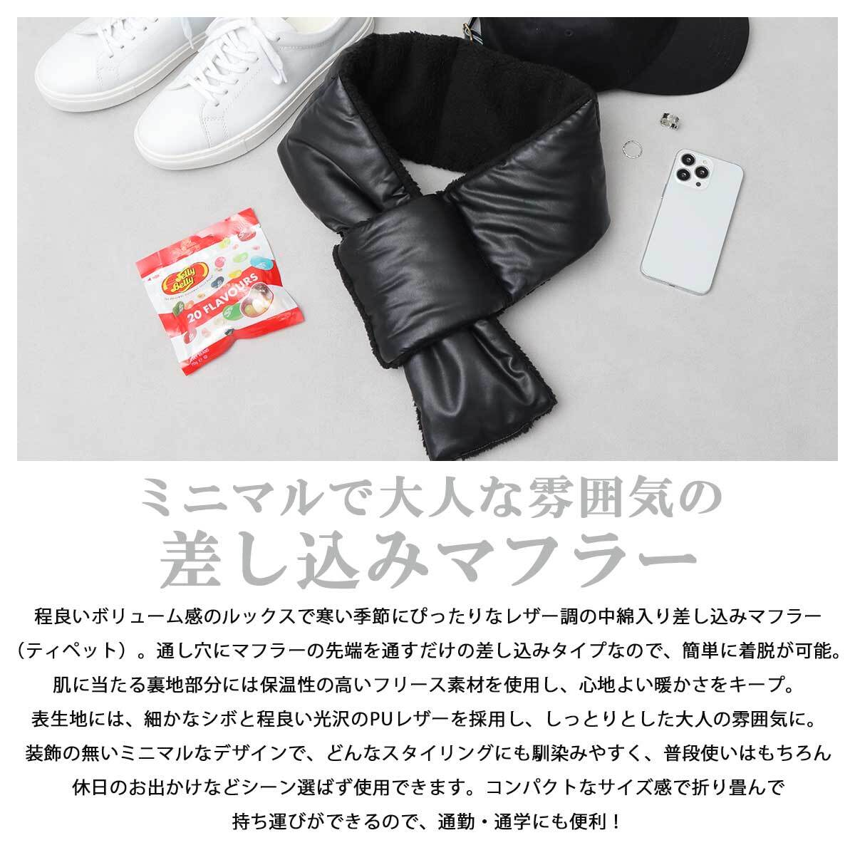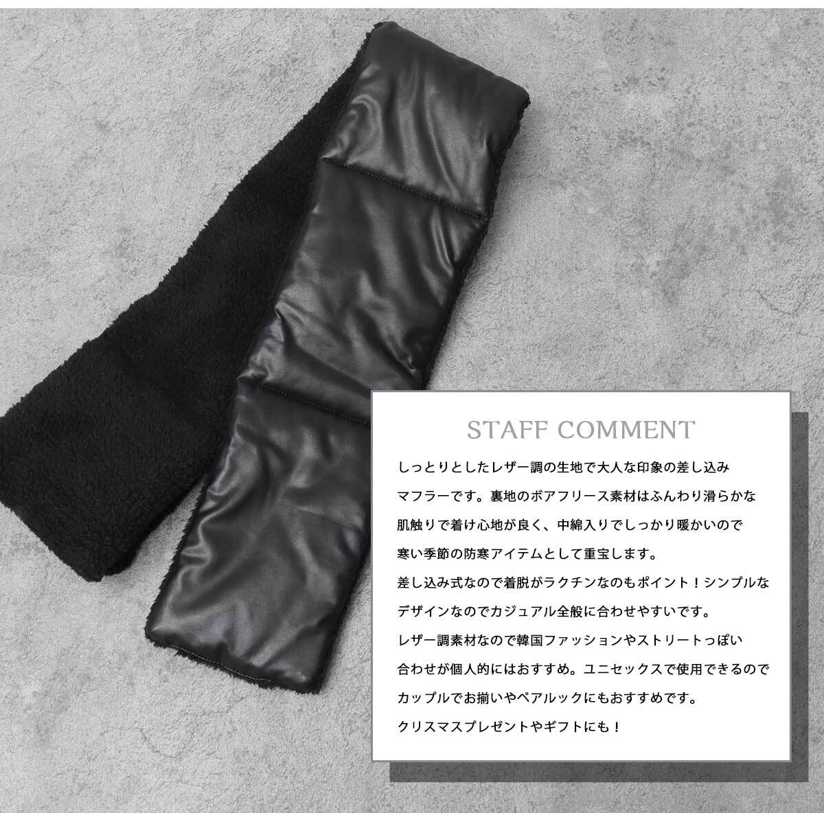 しっとりとしたレザー調の生地で大人な印象の差し込みマフラーです。裏地のボアフリース素材はふんわり滑らかな肌触りで着け心地が良く、中綿入りでしっかり暖かいので寒い季節の防寒アイテムとして重宝します。差し込み式なので着脱がラクチンなのもポイント!シンプルなデザインなのでカジュアル全般に合わせやすいです。レザー調素材なので韓国ファッションやストリートっぽい合わせが個人的にはおすすめ。ユニセックスで使用できるので、カップルでお揃いやペアルックにもおすすめです。クリスマスプレゼントやギフトにも!