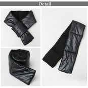 程良いボリューム感のルックスで寒い季節にぴったりなレザー調の中綿入り差し込みマフラー(ティペット)。通し穴にマフラーの先端を通すだけの差し込みタイプなので、簡単に着脱が可能。肌に当たる裏地部分には保温性の高いフリース素材を使用し、心地よい暖かさをキープ。表生地には、細かなシボ、程良い光沢のPUレザーを採用し、しっとりとした大人の雰囲気に。装飾の無いミニマルなデザインで、どんなスタイリングにも馴染みやすく、普段使いはもちろん、休日のお出かけなどシーン選ばず使用できます。コンパクトなサイズ感で折り畳んで持ち運びができるので、通勤・通学にも便利!