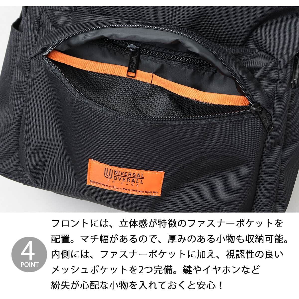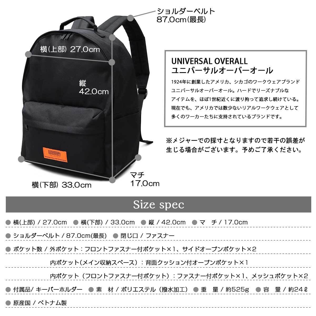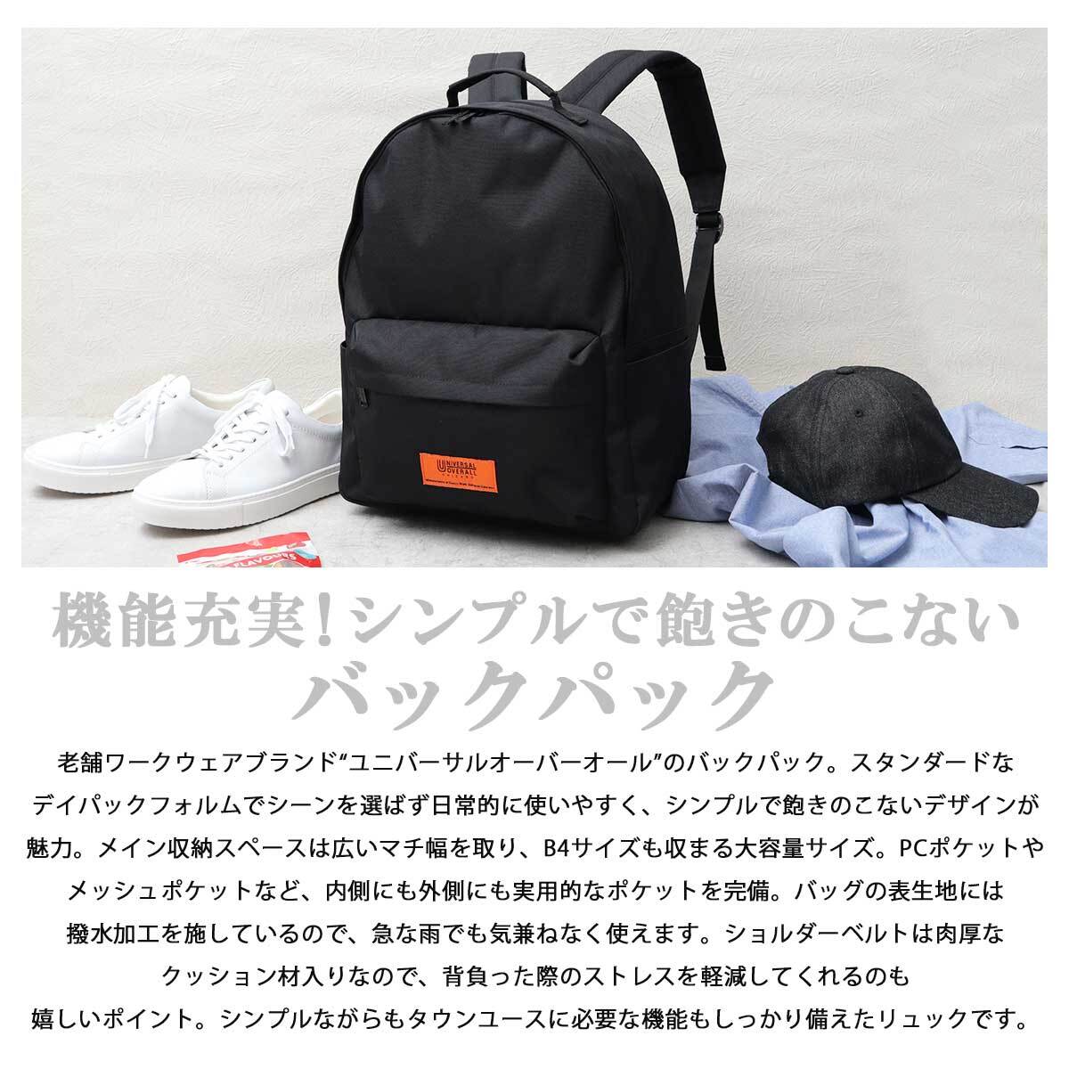 老舗ワークウェアブランド“ユニバーサルオーバーオール”のバックパック。スタンダードなデイパックフォルムでシーンを選ばず日常的に使いやすく、シンプルで飽きのこないデザインが魅力。メイン収納スペースは広いマチ幅を取り、B4サイズも収まる大容量サイズ。PCポケットやメッシュポケットなど、内側にも外側にも実用的なポケットを完備。バッグの表生地には撥水加工を施しているので、急な雨でも気兼ねなく使えます。ショルダーベルトは肉厚なクッション材入りなので、背負った際のストレスを軽減してくれるのも嬉しいポイント。シンプルながらもタウンユースに必要な機能もしっかり備えたリュックです。