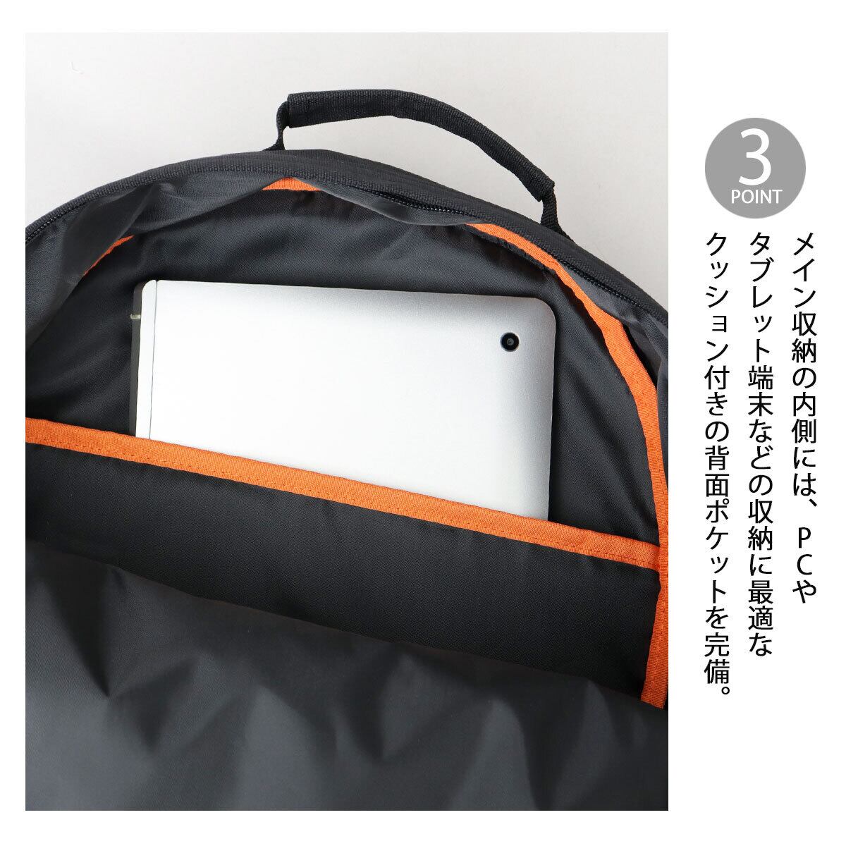 メイン収納の内側には、PCやタブレット端末などの収納に最適なクッション付きの背面ポケットを完備。