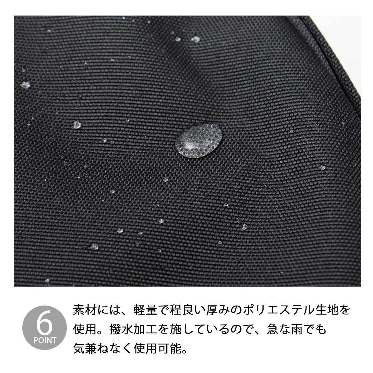 素材には、軽量で程良い厚みのポリエステル生地を使用。撥水加工を施しているので、急な雨でも気兼ねなく使用可能。