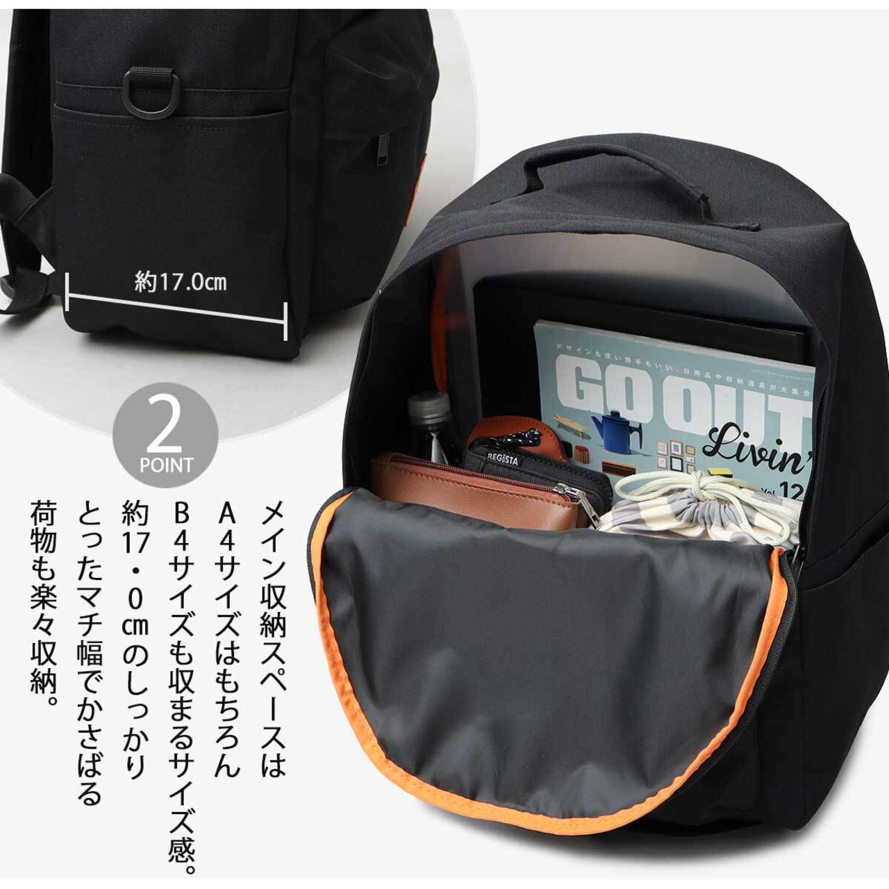 メイン収納スペースは、A4サイズはもちろん、B4サイズも収まるサイズ感。約17.0cmのしっかりとったマチ幅でかさばる荷物も楽々収納。
