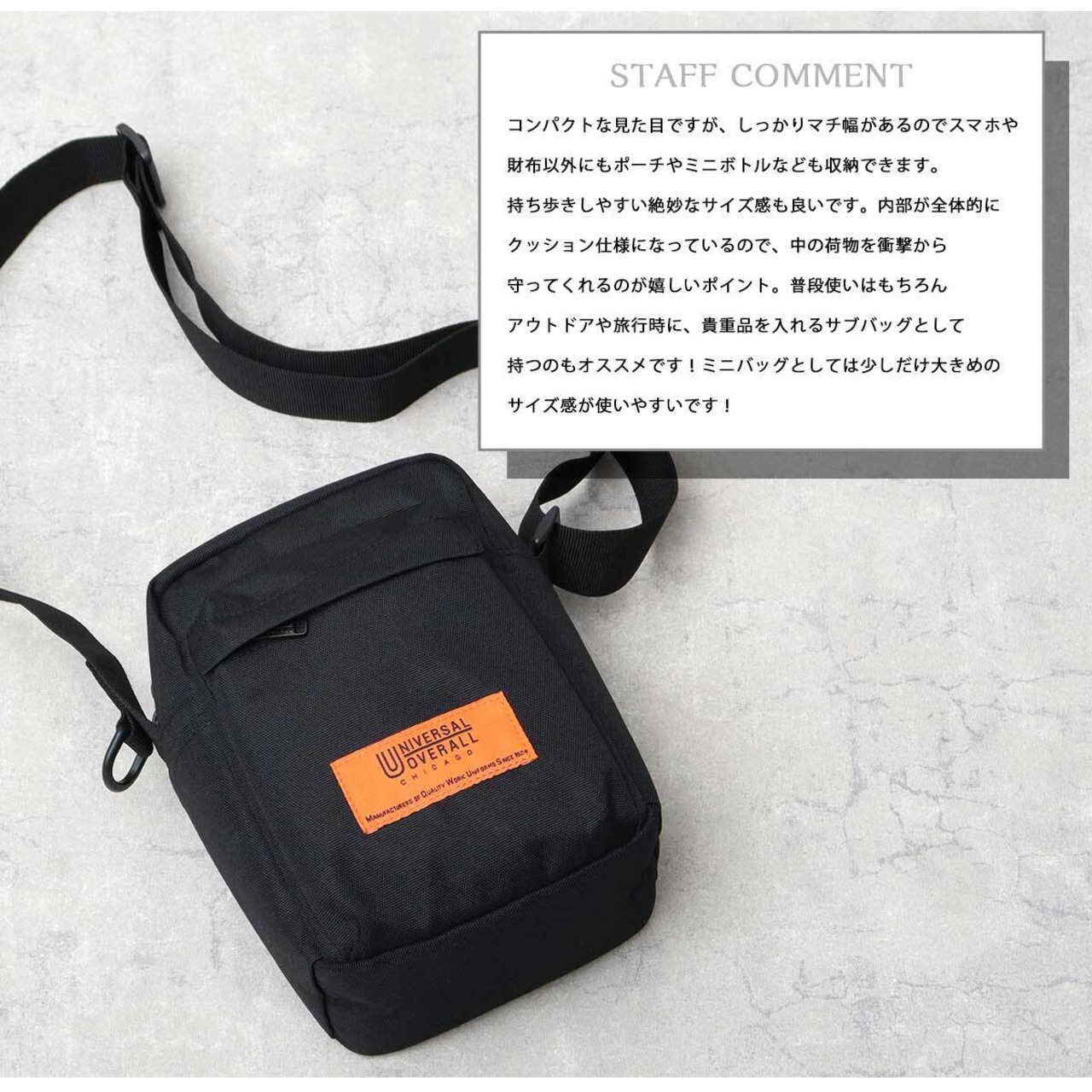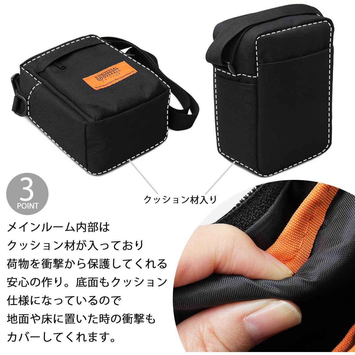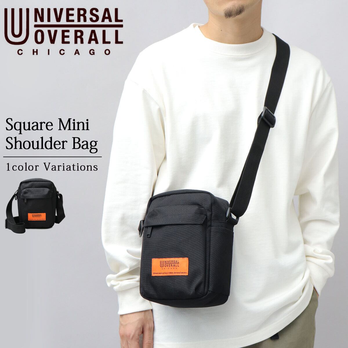 老舗ワークウェアブランド“ユニバーサルオーバーオール”のスクエアミニショルダーバッグ。トレンド感のあるスクエア型のシルエットとマチ幅を取った少し大きめなサイズ感が魅力。メインルームはスマホや財布、ポーチなど普段使いの小物を楽に収納可能。内部や底面はクッション仕様になっており、スマホなどの電子機器や貴重品を衝撃から保護してくれるのも嬉しいポイント。背面オープンポケットなど、デイリーユースに使いやすい機能も完備。普段使いはもちろん、ちょっとしたお出かけや旅行時のサブバッグとしてもオススメなアイテム。