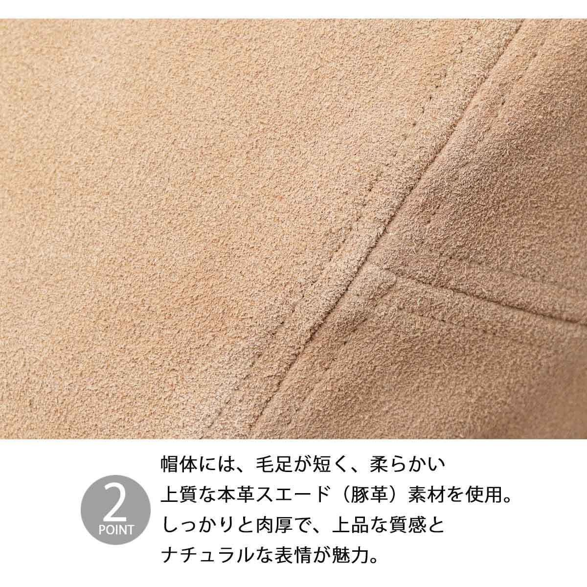 帽体には、毛足が短く、柔らかい、上質な本革スエード(豚革)素材を使用。しっかりと肉厚で、上品な質感と、ナチュラルな表情が魅力。