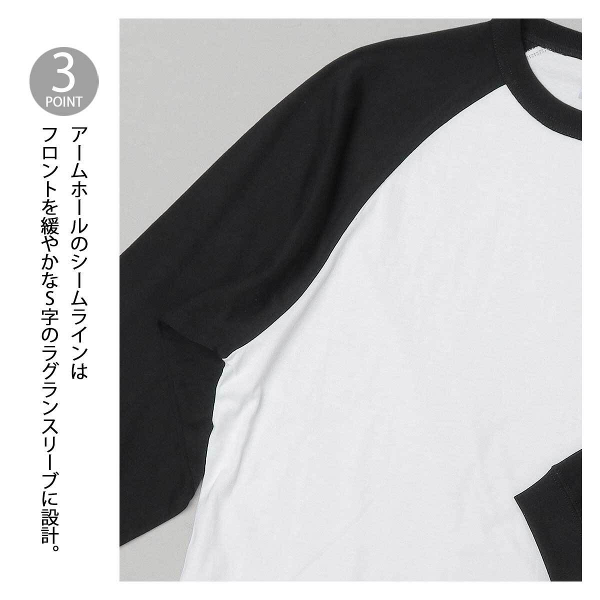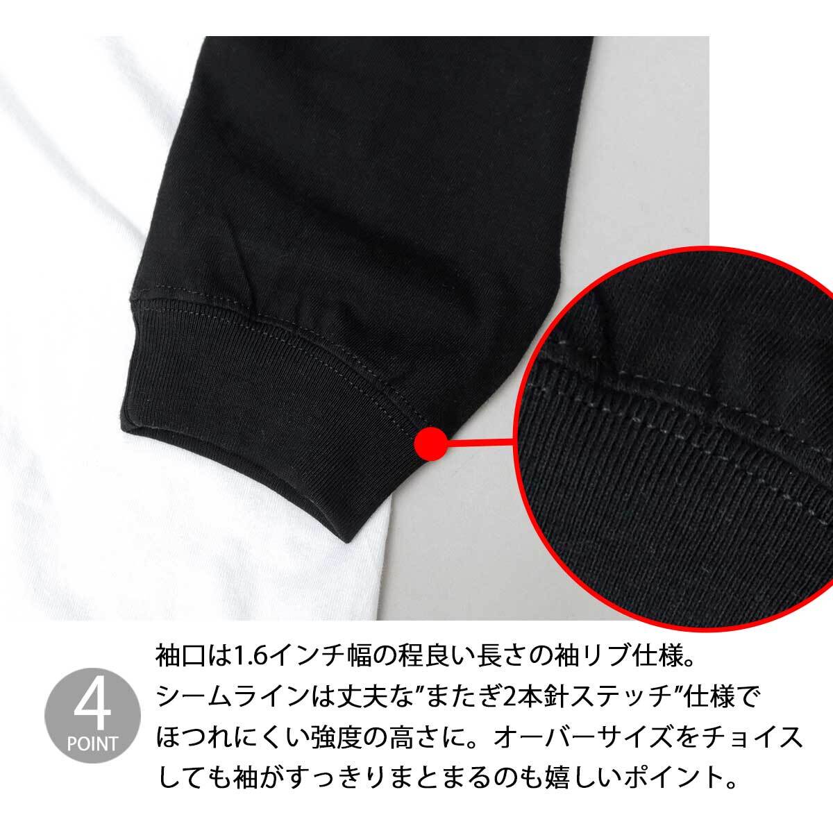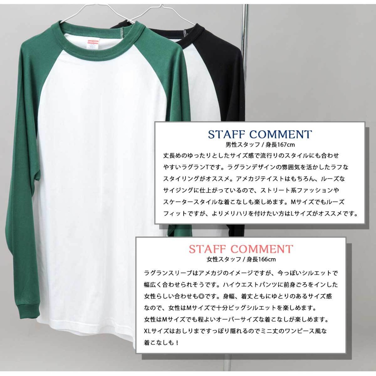 丈長めのゆったりとしたサイズ感で流行りのスタイルにも合わせやすいラグランTです。ラグランデザインの雰囲気を活かしたラフなスタイリングがオススメ。アメカジテイストはもちろん、ルーズなサイジングに仕上がっているので、ストリート系ファッションやスケータースタイルな着こなしも楽しめます。Mサイズでもルーズフィットですが、よりメリハリを付けたい方はLサイズがオススメです。(モデル:167cm)
