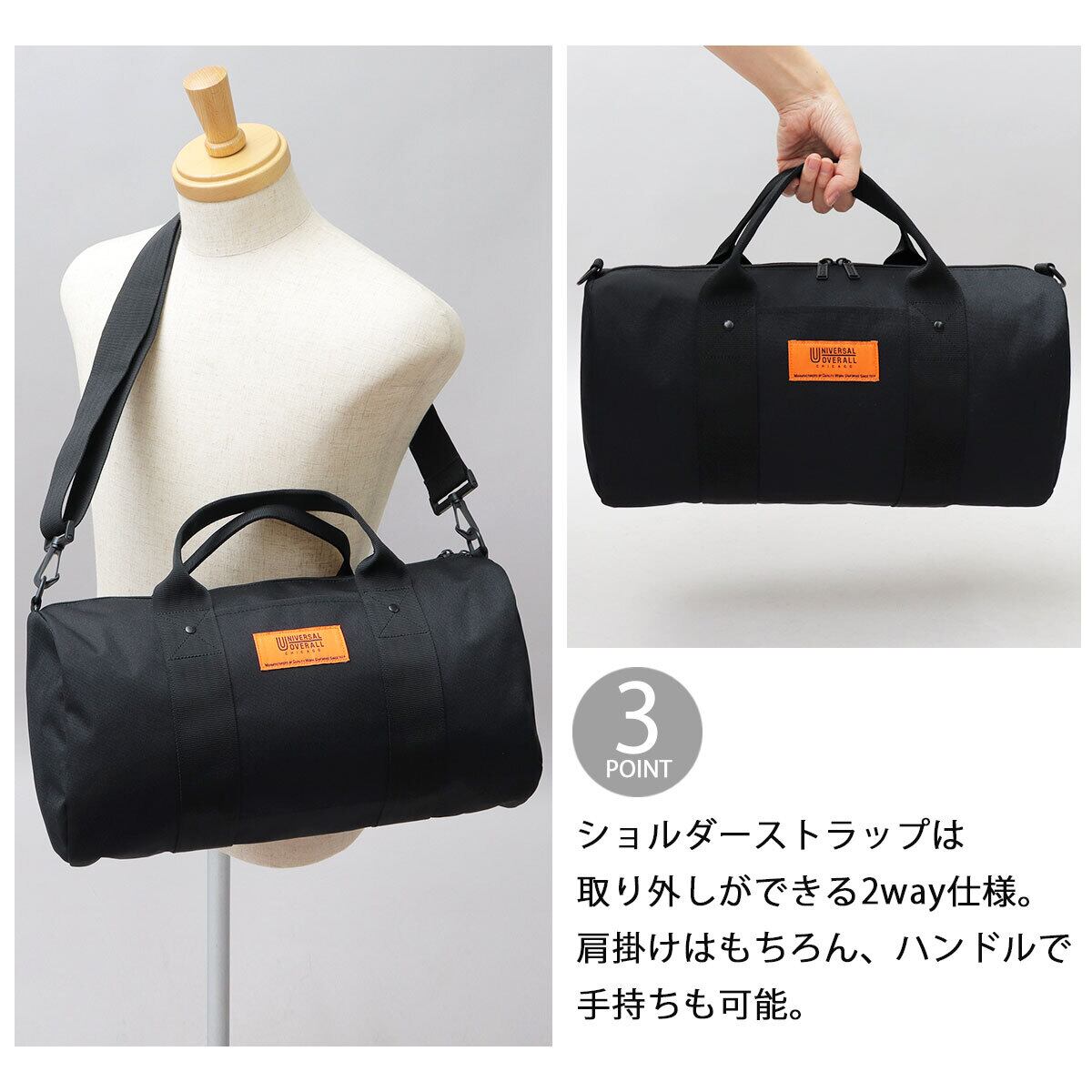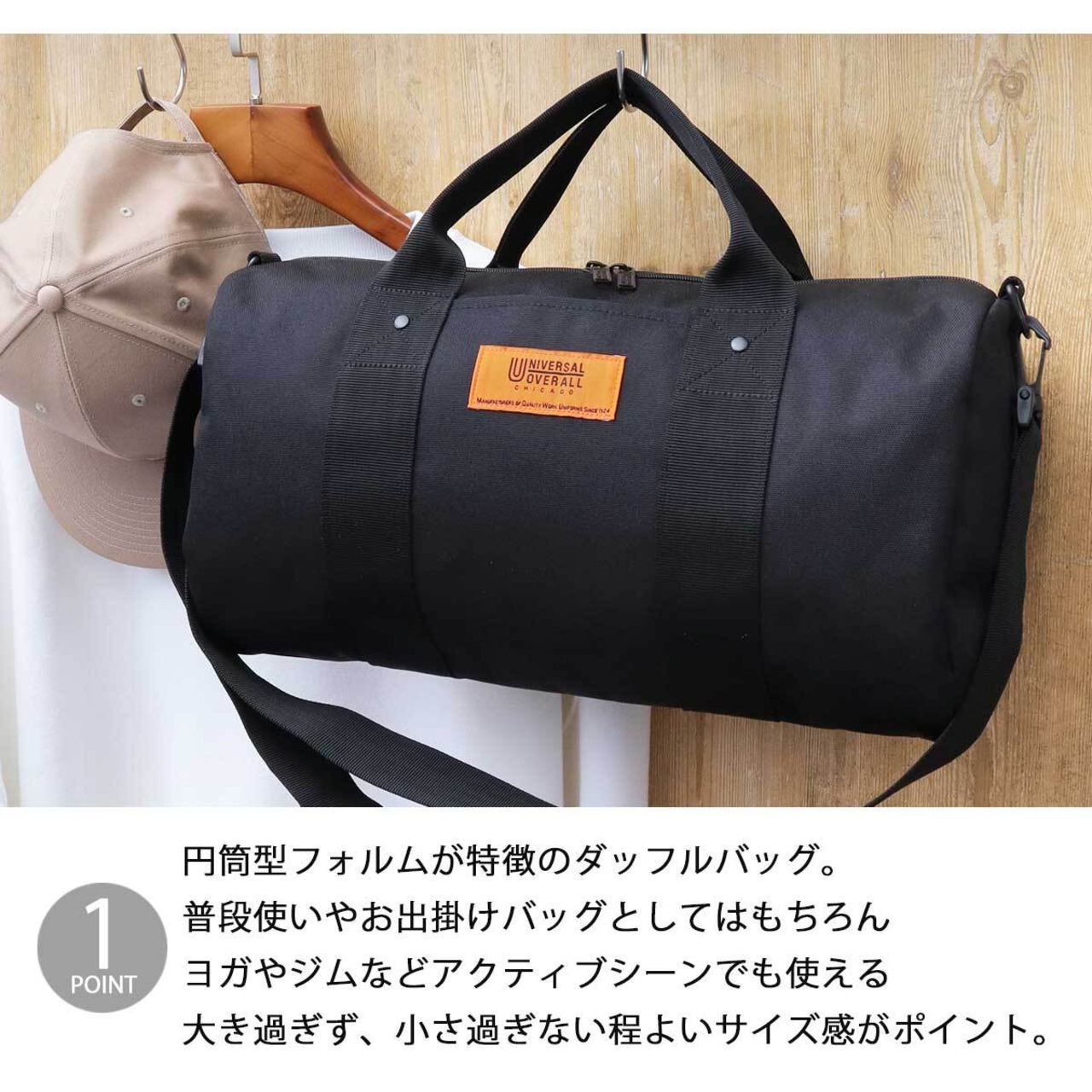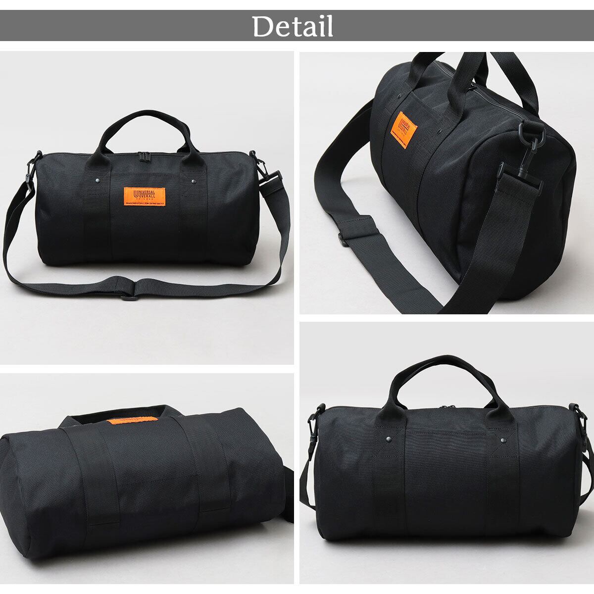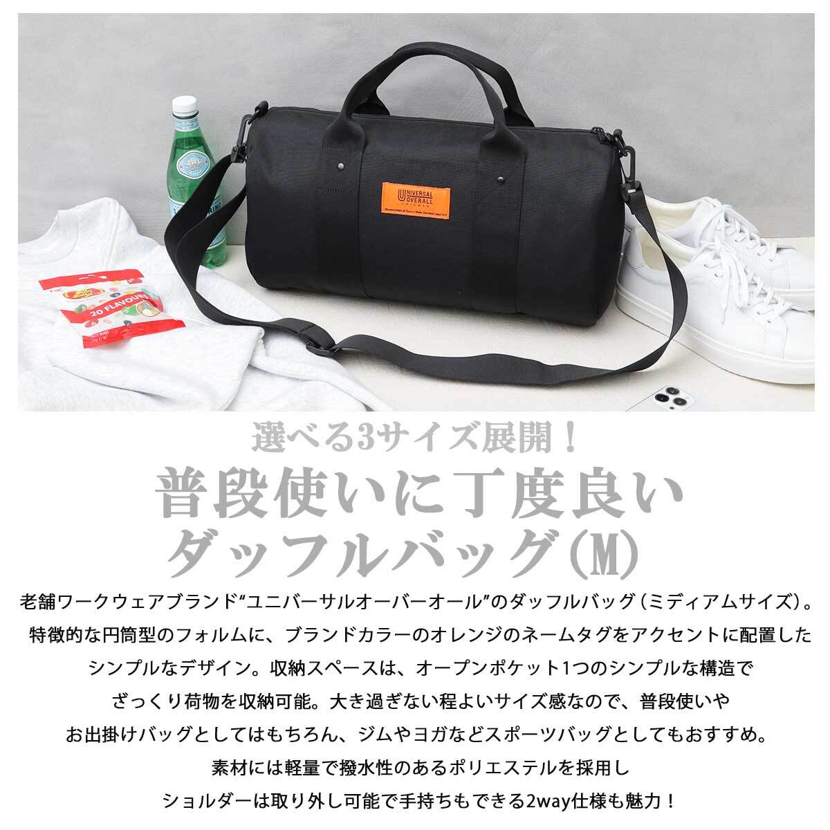 老舗ワークウェアブランド“ユニバーサルオーバーオール”のダッフルバッグ(ミディアムサイズ)。特徴的な円筒型のフォルムに、ブランドカラーのオレンジのネームタグをアクセントに配置したシンプルなデザイン。収納スペースは、オープンポケット1つのシンプルな構造で、ざっくり荷物を収納可能。大き過ぎない程よいサイズ感なので、普段使いやお出掛けバッグとしてはもちろん、ジムやヨガなどスポーツバッグとしてもおすすめ。素材には軽量で撥水性のあるポリエステルを採用し、ショルダーは取り外し可能で手持ちもできる2way仕様も魅力!