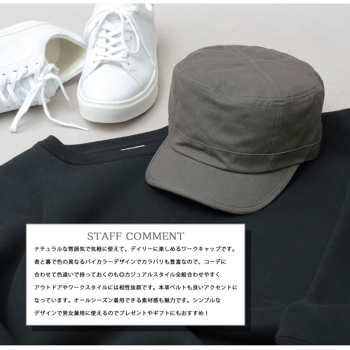 ナチュラルな雰囲気で気軽に使えて、デイリーに楽しめるワークキャップです。表と裏で色の異なるバイカラーデザインで、カラバリも豊富なので、コーデに合わせて色違いで持っておくのも◎カジュアルスタイル全般合わせやすく、アウトドアやワークスタイルには相性抜群です。本革ベルトも良いアクセントになっています。オールシーズン着用できる素材感も魅力です。シンプルなデザインで男女兼用に使えるのでプレゼントやギフトにもおすすめ!