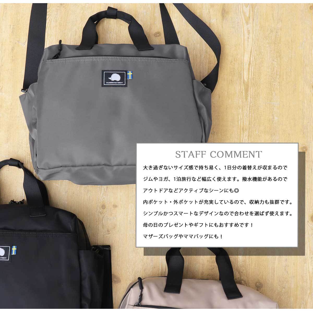 大き過ぎないサイズ感で持ち易く、1日分の着替えが収まるので、ジムやヨガ、1泊旅行など幅広く使えます。撥水機能があるので、アウトドアなどアクティブなシーンにも◎内ポケット・外ポケットが充実しているので、収納力も抜群です。シンプルかつスマートなデザインなので合わせを選ばず使えます。母の日のプレゼントやギフトにもおすすめです!マザーズバッグやママバッグにも!