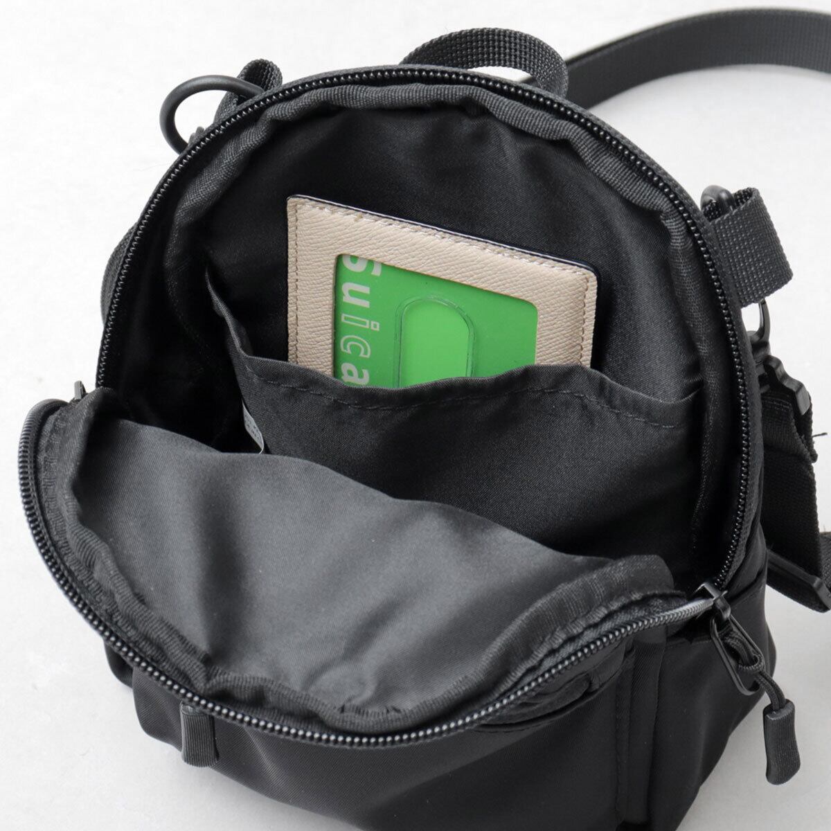 収納スペースは、スマホやミニ財布など必要最低限のアイテムが収まるサイズ感。しっかりマチ幅があるので、厚みのある小物も収納可能。内側には、小分けに便利なオープンポケットを配置。