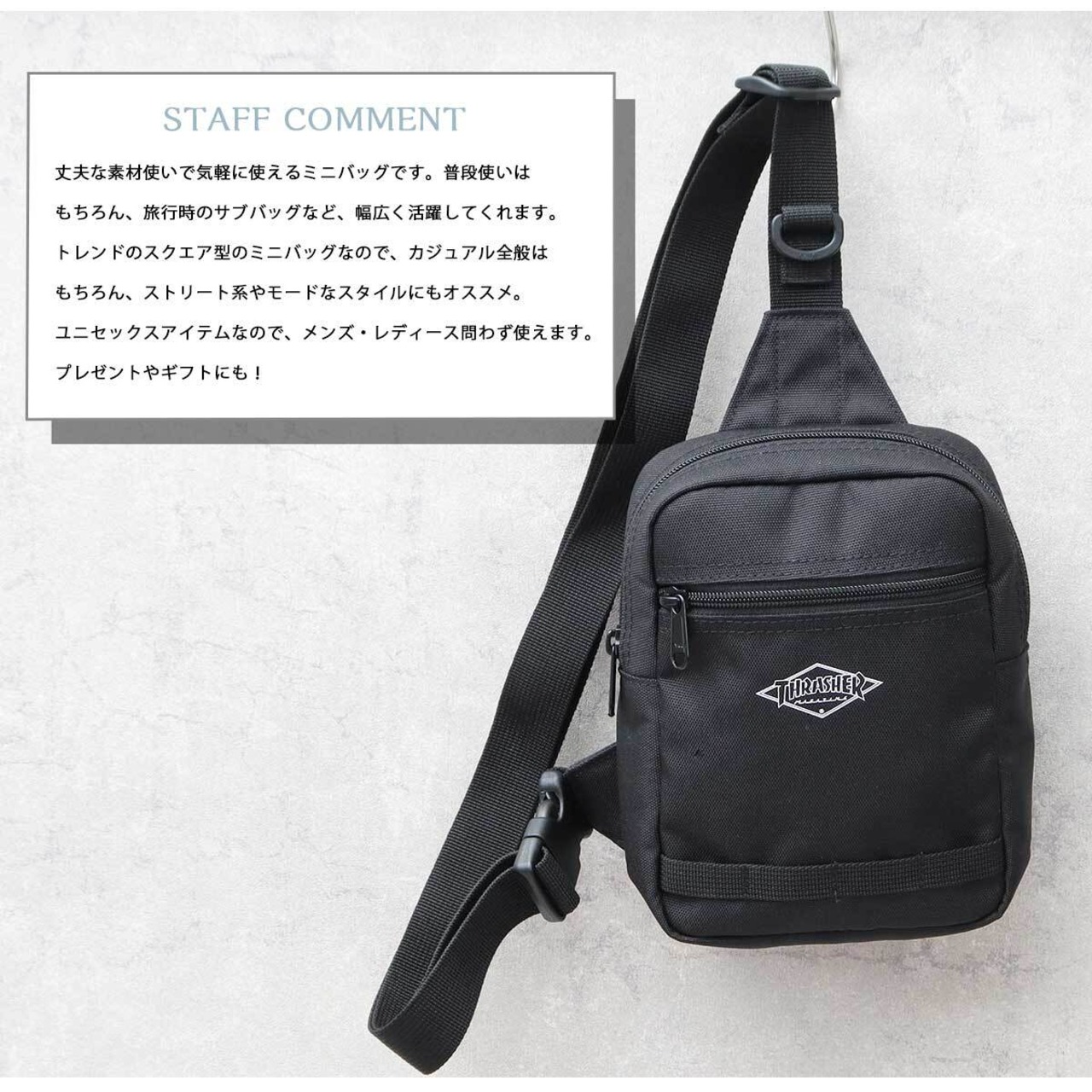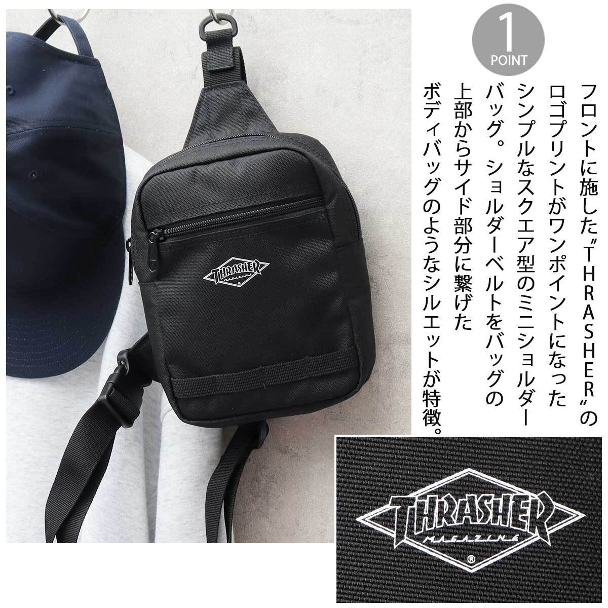 フロントに施した”THRASHER”のロゴプリントがワンポイントになった、シンプルなスクエア型のミニショルダーバッグ。ショルダーベルトをバッグの上部からサイド部分に繋げた、ボディバッグのようなシルエットが特徴。