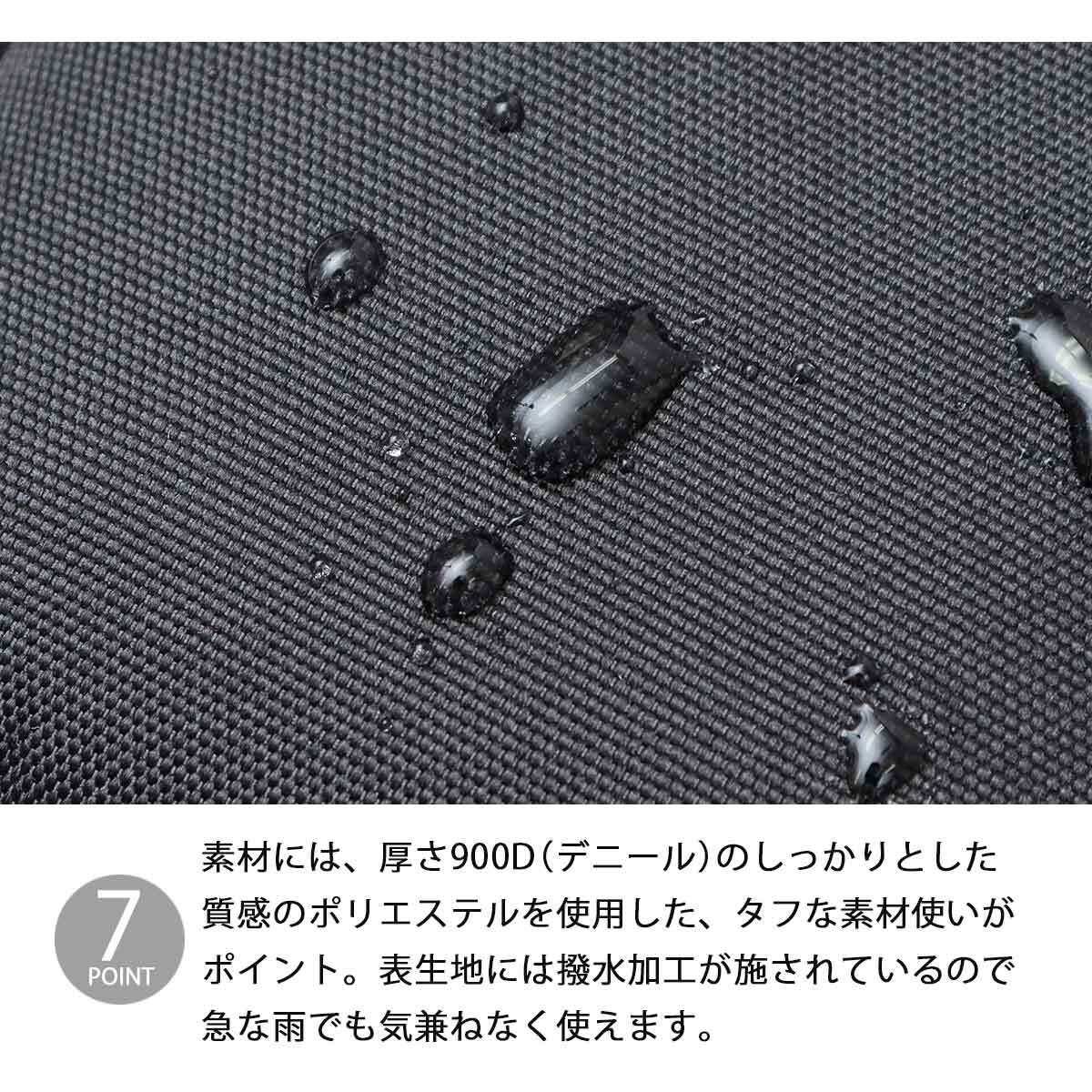 素材には、厚さ900D(デニール)のしっかりとした質感のポリエステルを使用した、タフな素材使いがポイント。表生地には撥水加工を施しているので、急な雨でも気兼ねなく使えます。