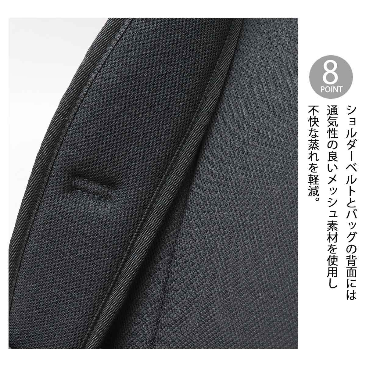 ショルダーベルトとバッグの背面には、通気性の良いメッシュ素材を使用し、不快な蒸れを軽減。