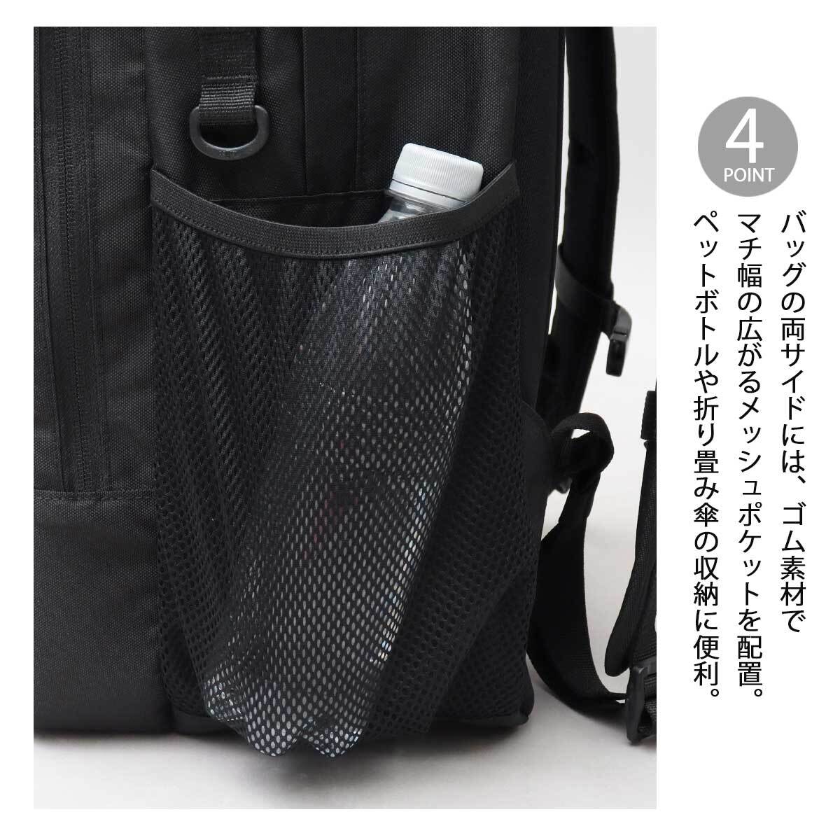 バッグの両サイドには、ゴム素材でマチ幅の広がるメッシュポケットを配置。ペットボトルや折り畳み傘の収納に便利。