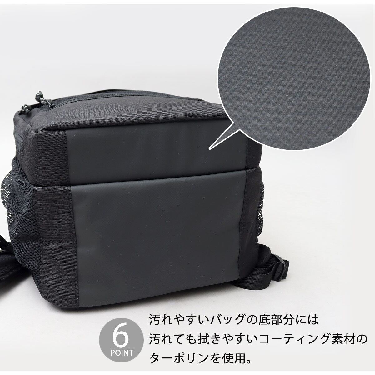 汚れやすいバッグの底部分には、汚れても拭きやすいコーティング素材のターポリンを使用。