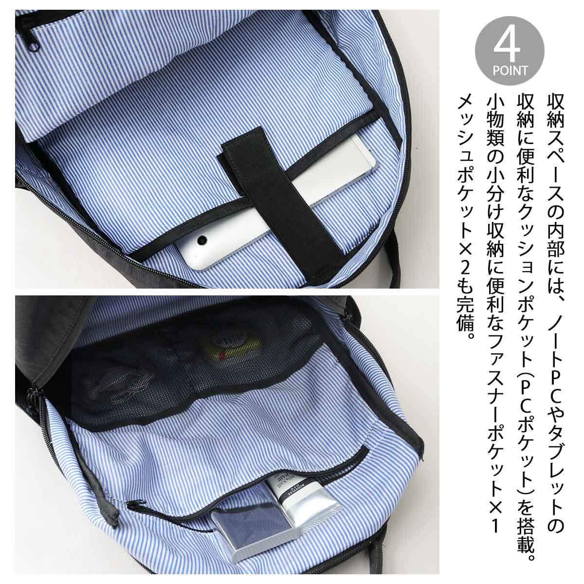 収納スペースの内部には、ノートPCやタブレットの収納に便利なクッションポケット(PCポケット)を搭載。小物類の小分け収納に便利なファスナーポケット×1、メッシュポケット×2も完備。