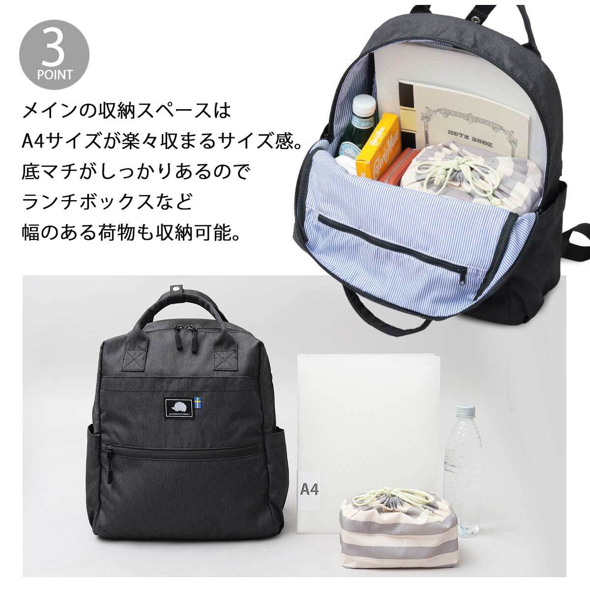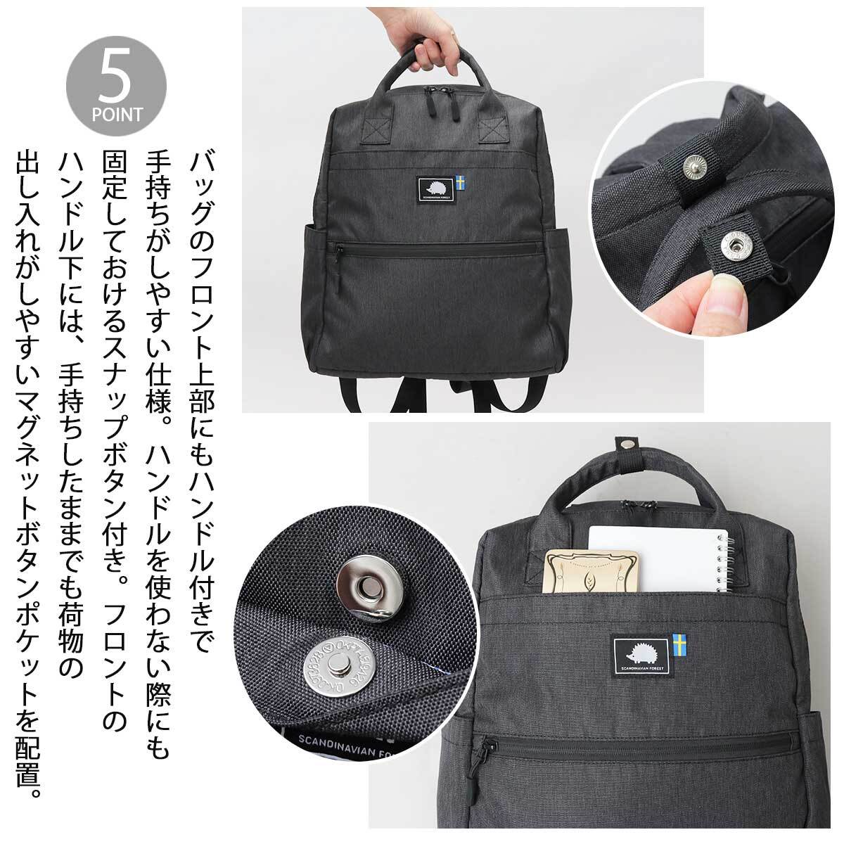愛らしいハリネズミのモチーフが印象的な北欧ブランド”SCANDINAVIAN FOREST(スカンジナビアン・フォレスト)”のハンドル付きバックパック。ヘザーカラーの程よいカジュアル感が魅力の杢調シリーズがリニューアル!更に軽量になって使いやすく、嬉しい撥水機能も付きました◎バッグの上部にはハンドル付きで、電車やバス内でも手持ちしやすいのがポイント。収納スペースはA4サイズが楽々収まるサイズ感で、内側にも、外側にも実用的なポケットがたくさん付いているので収納力も抜群!通勤・通学にはもちろん、ビジネスシーンにも活躍するアイテムです。リュックが大好きなリュック女子や、マザーズリュック・ママバッグにもオススメ!