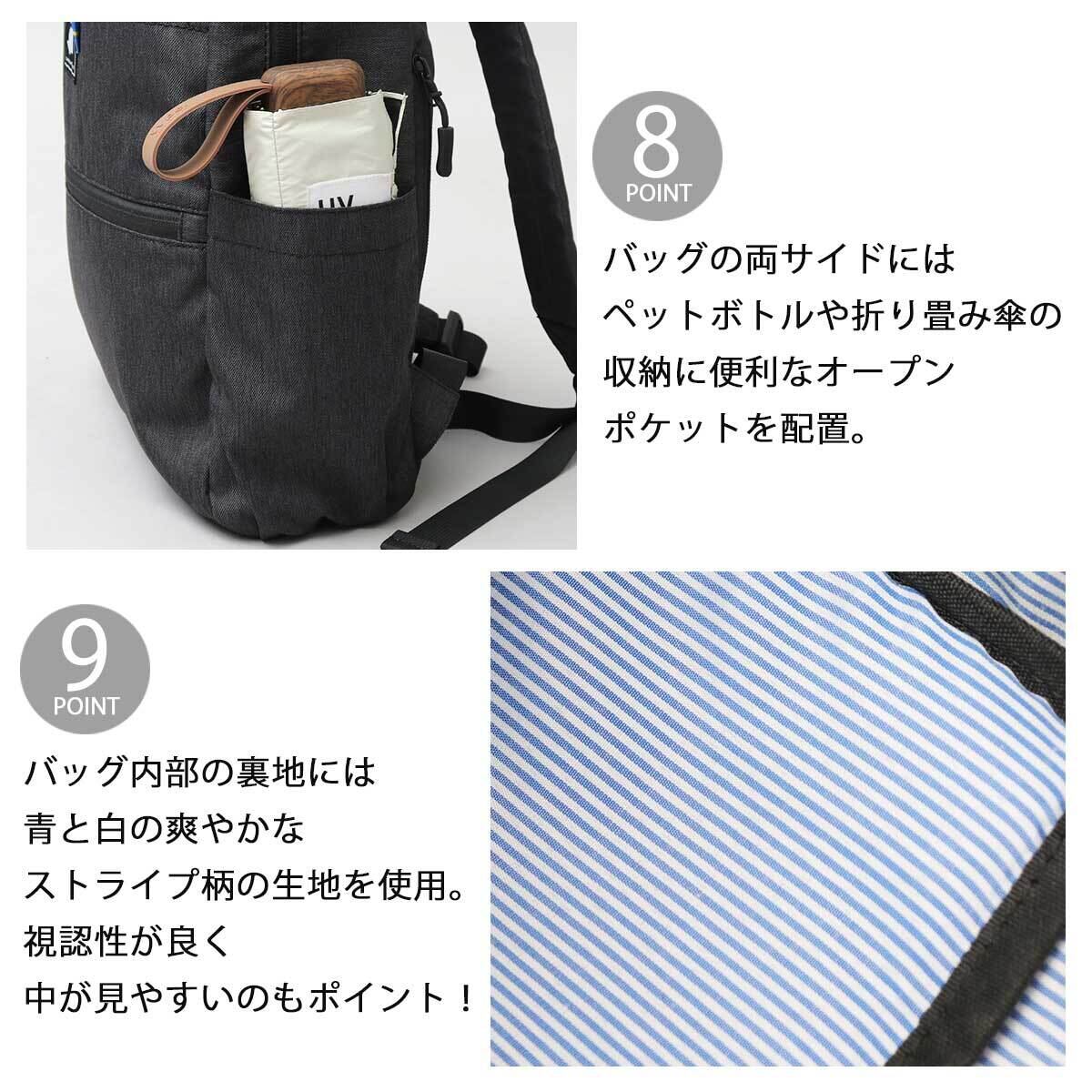 程良くカジュアルなヘザーカラーの生地感が良いです。書類やファイル、教科書なども楽々収まり、PCポケットやボトルポケットなど、あると便利なポケットがしっかり備わっているので、タウンユースにぴったり!学生さんや社会人の方におすすめのバッグです。撥水機能もあるので、普段使いはもちろん、旅行やアウトドア・レジャーなどアクティブなシーンにも活躍してくれます。メンズ・レディース問わず使えるユニセックスアイテムなので、母の日のプレゼントやギフトにもオススメです!
