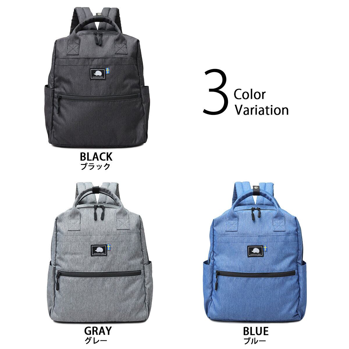 ヘザーカラーの程良いカジュアル感が魅力の”杢調シリーズ”のハンドル付きリュックサック。フロント部分に配置した、ブランドアイコンでもあるハリネズミのネームタグとスウェーデン国旗のピスタグが目を惹くワンポイント。