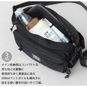 メイン収納部はコンパクトな見た目とは裏腹に、普段持ち歩く貴重品に加え、500mlペットボトルも横向きに収まる使い勝手の良いサイズ感。