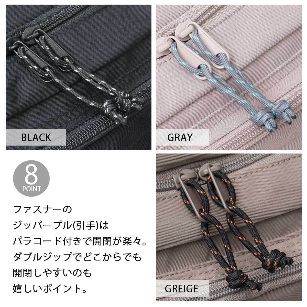 正面には立体感のある薄マチのファスナーポケットと、マチ無しの薄型ファスナーポケットを2層で配置。お財布・スマホ・ICカードなどの出し入れの多い小物の収納に便利。