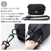 ショルダーストラップは取り外しができ、ウエストベルトはバッグ背面のポケットに収納できるので、どちらかを使わない際も邪魔にならない便利な仕様。