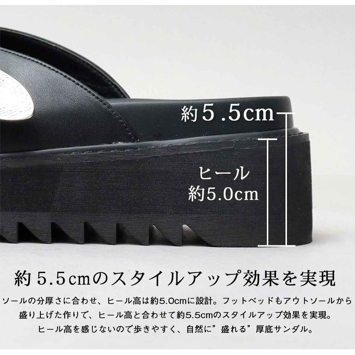 ソールの分厚さに合わせ、ヒール高は約5.0cmに設計。フットベッドもアウトソールから盛り上げた作りで、ヒール高と合わせて約5.5cmのスタイルアップ効果を実現。ヒール高を感じないので歩きやすく、自然に”盛れる”厚底サンダル。