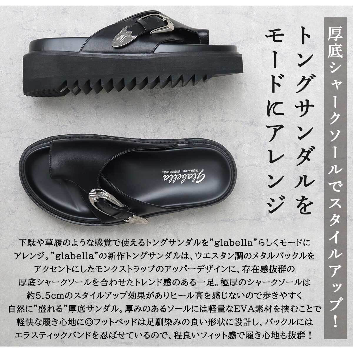 下駄や草履のような感覚で使えるトングサンダルを”glabella”らしくモードにアレンジ。”glabella”の新作トングサンダルは、ウエスタン調のメタルバックルをアクセントにしたモンクストラップのアッパーデザインに、存在感抜群の厚底シャークソールを合わせたトレンド感のある一足。極厚のシャークソールは約5.5cmのスタイルアップ効果があり、ヒール高を感じないので歩きやすく、自然に”盛れる”厚底サンダルです。厚みのあるソールには軽量なEVA素材を挟むことで、軽快な履き心地に◎フットベッドは足馴染みの良い形状に設計し、バックルにはエラスティックバンドを忍ばせているので、程良いフィット感で履き心地も抜群!