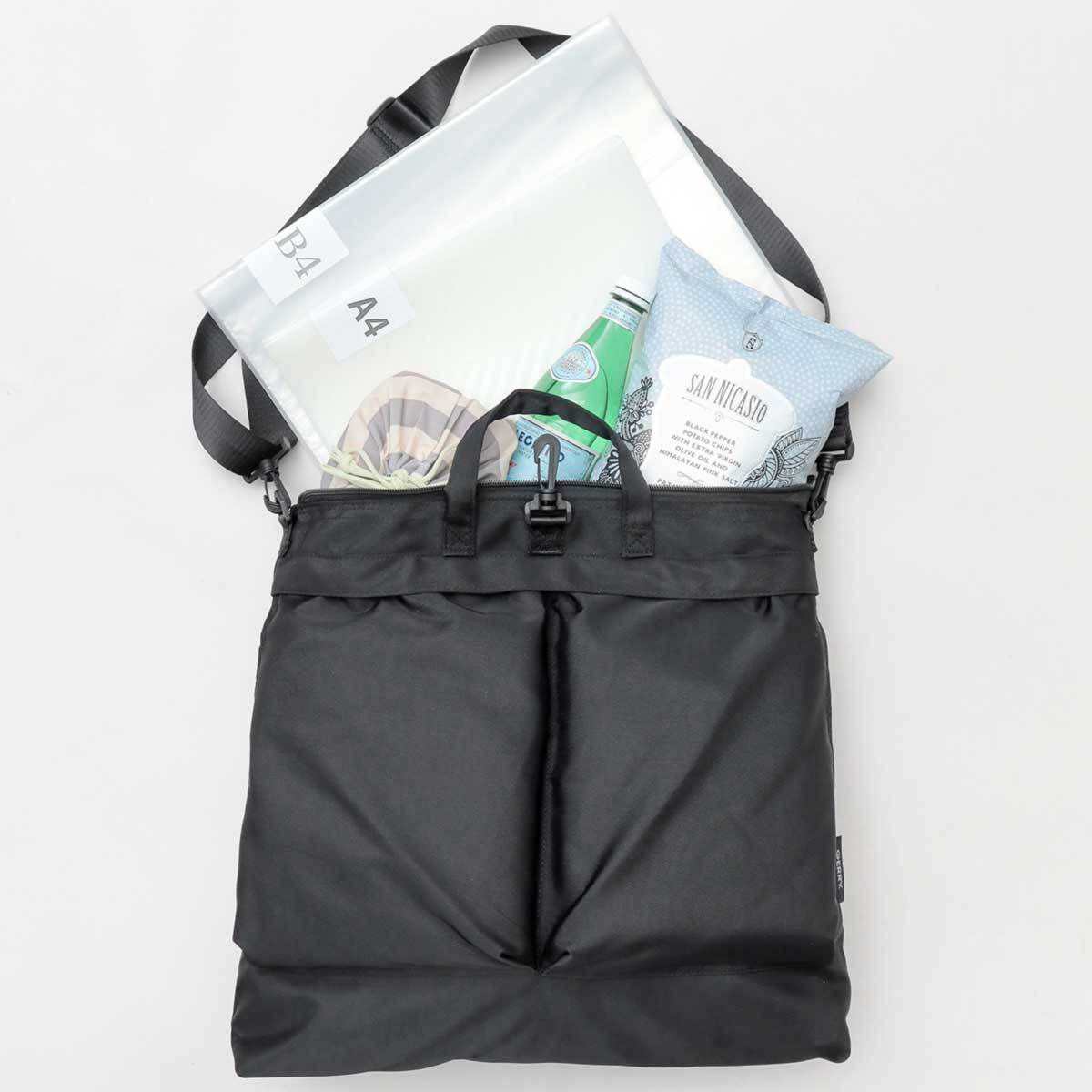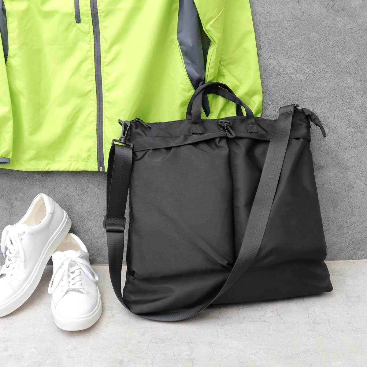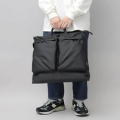 大容量で使い勝手の良いヘルメットバッグです。ざっくりとした使い心地で、ガシガシ使っていけそうです。シンプルなデザインなので、カジュアルにはもちろん、ストリートやミリタリー、ワークスタイルやアウトドアなど幅広いコーデにマッチします。オールブラックのミニマルな雰囲気なので、ロングコートやスーツなどかっちりとしたスタイルにも以外と合わせやすいです。キレイめなスタイルやモード系などの外しにも◎A4、B4サイズが楽々収まるので通勤・通学バッグにも最適!ジムバッグ、マザーズバッグや、手持ちができるので、ブリーフケース感覚でカジュアルめなビジネスバッグとしても使えそうです。メンズ・レディース問わず使えるので、プレゼントやギフトにもおすすめ!