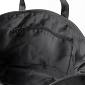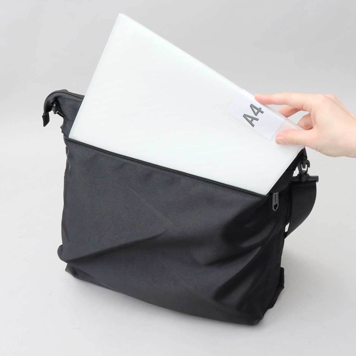 バッグの背面には、大きいサイズのファスナーポケットを配置。内部はA4サイズがすっぽり収まるサイズ感で、やや底マチのある仕様。