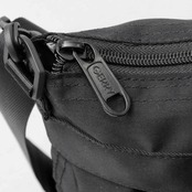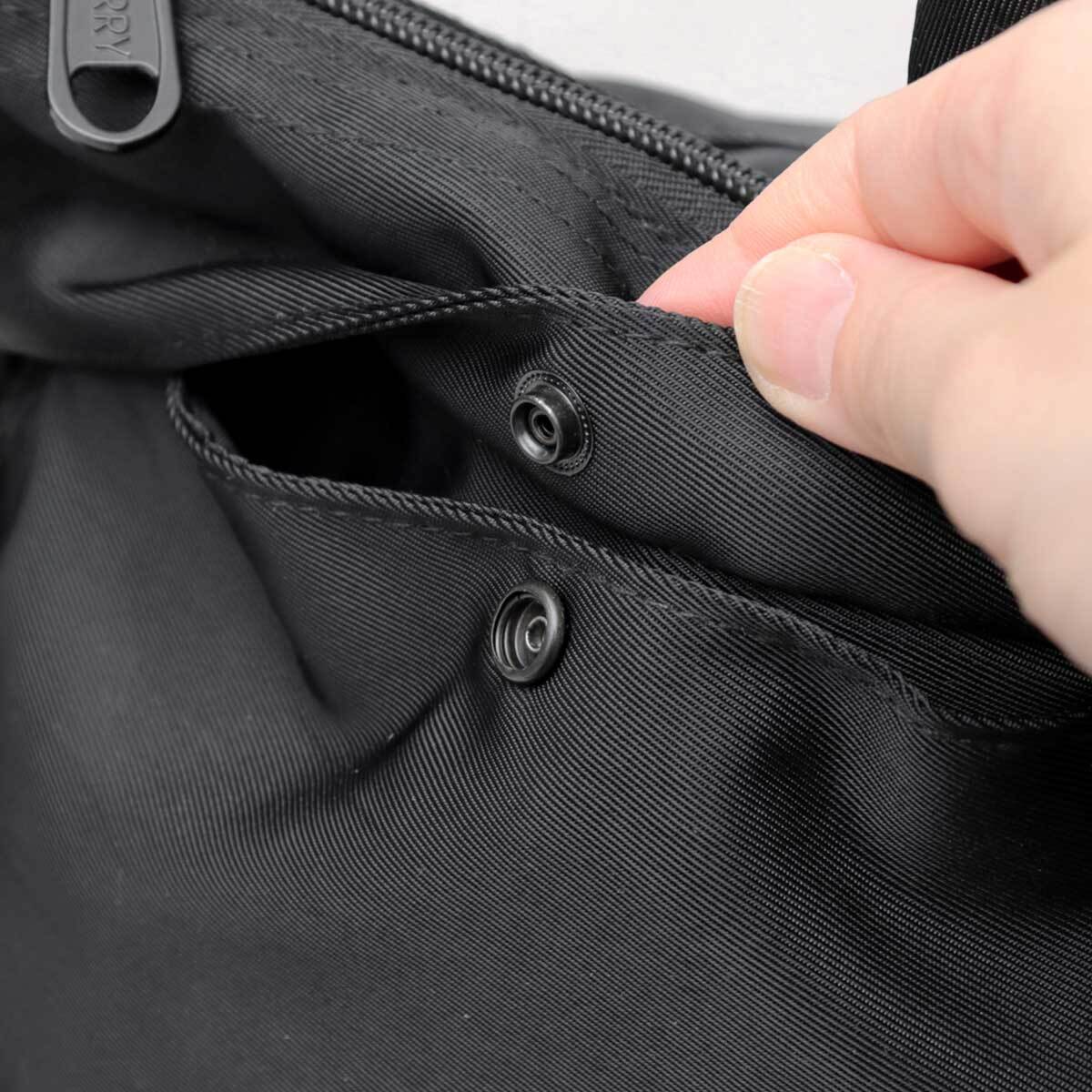 バッグのフロント部分には、ヘルメットバッグの特徴でもある2つのフラップポケットを配置。内部は500mlのペットボトルも余裕で収まる大きめのサイズ感。フラップはドットボタンで開閉が可能。