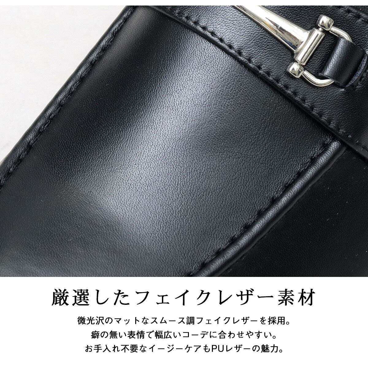 微光沢のマットなスムース調フェイクレザーを採用。癖の無い表情で幅広いコーデに合わせやすい。お手入れ不要なイージーケアもPUレザーの魅力。