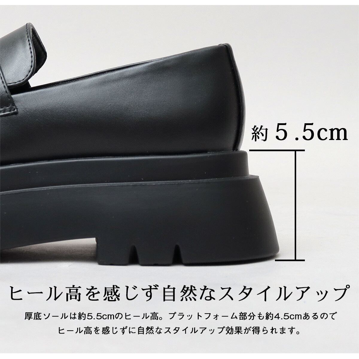 厚底ソールは約5.5cmのヒール高があり、自然なスタイルアップ効果が得られます。ソール全体に高さを持たせたフラットな作りなので、ヒール高を感じずに歩きやすいのもポイント。