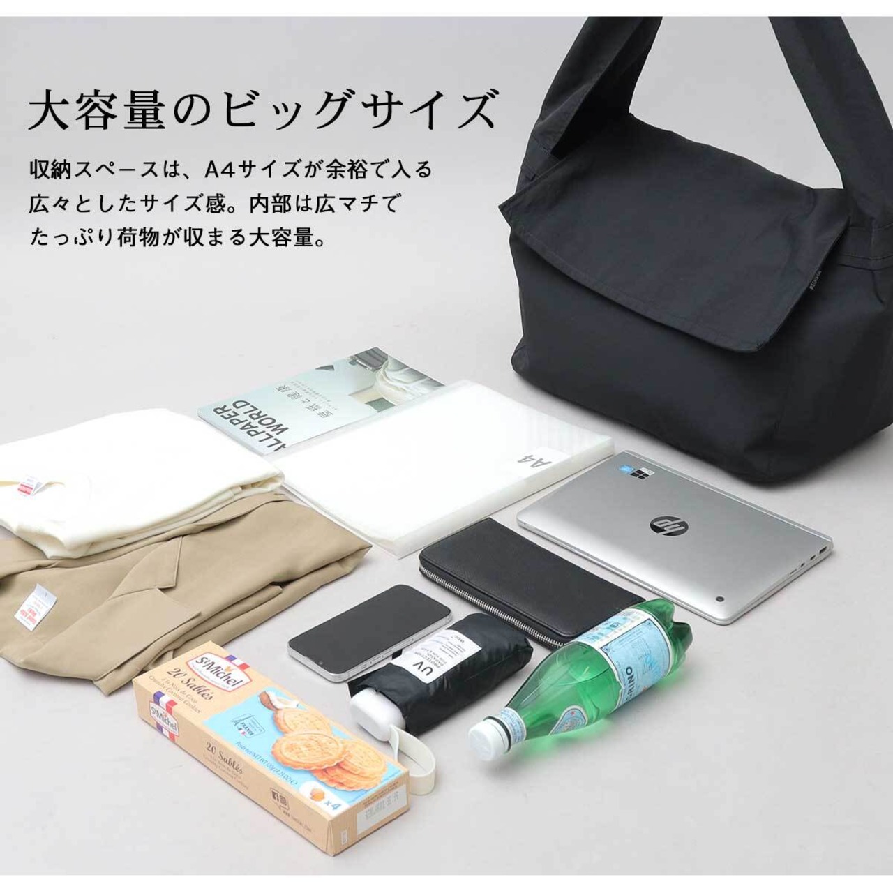 ショルダーストラップは約20.0cm幅のワイドサイズで、斜めがけした際の肩へのフィット感も抜群。幅広のショルダーは細く折ってクシャっと持つことで、コーデに雰囲気をプラスしてくれます。