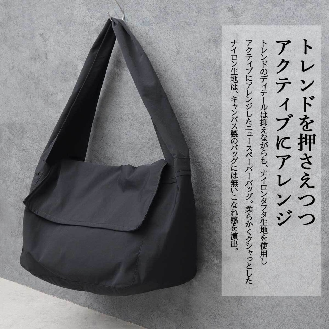 トレンドのニュースペーパーバックは帆布生地のものが主流ですが、こちらは撥水機能のあるナイロン素材を使用しているので、よりアクティブに使えそう。柔らかくシャリっとした生地でこなれた印象があり、大人の雰囲気です。シンプルな無地デザインなので、大人カジュアルやアウトドアスタイル、スポーティーなスタイル、FUDGE系、古着系、ストリート系と幅広く相性◎セットアップやジャケット、スラックスなど上品なアイテムとの合わせも相性良さそうです。