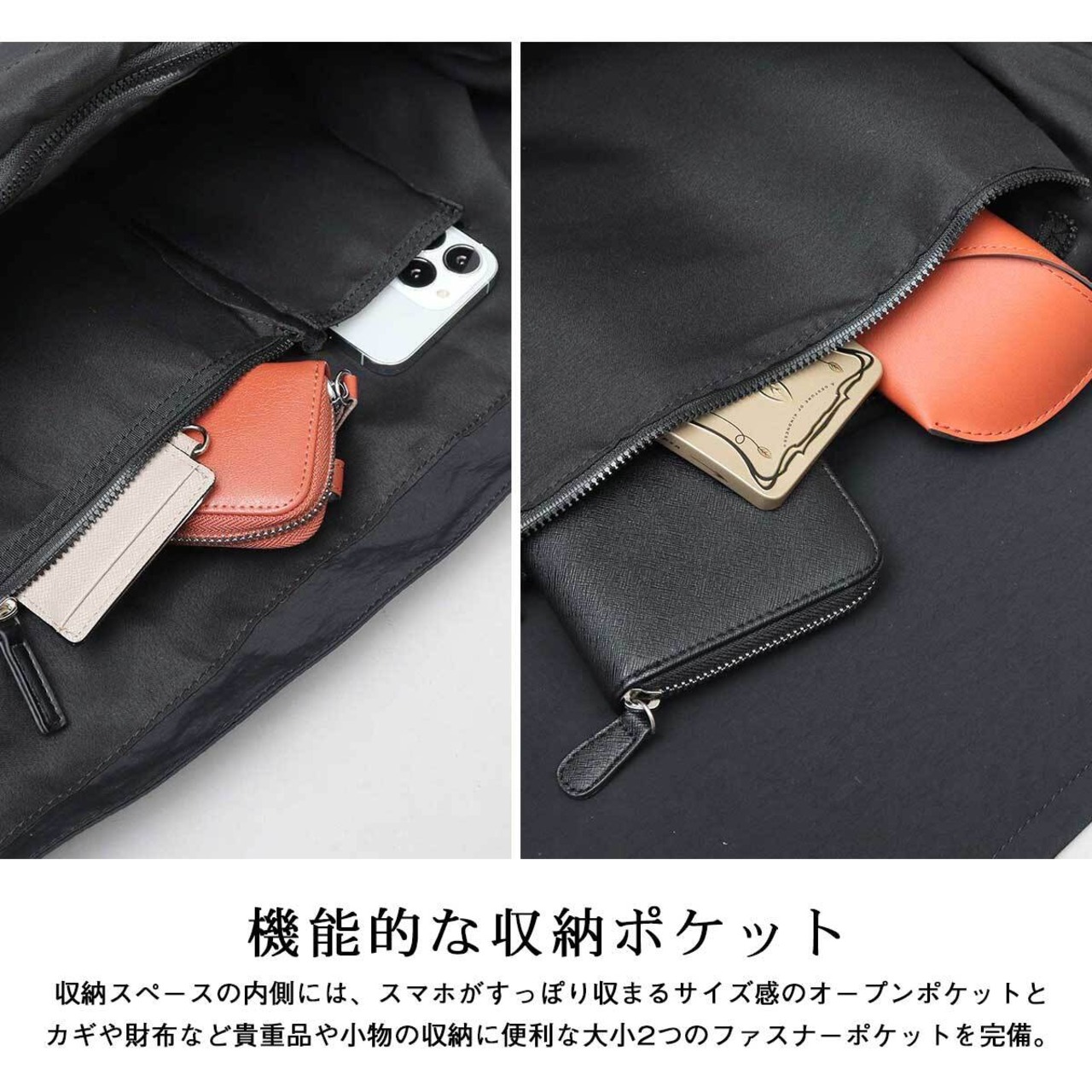収納スペースの内側には、スマホがすっぽり収まるサイズ感のオープンポケットと、カギや財布など貴重品や小物の収納に便利な大小2つのファスナーポケットを完備。