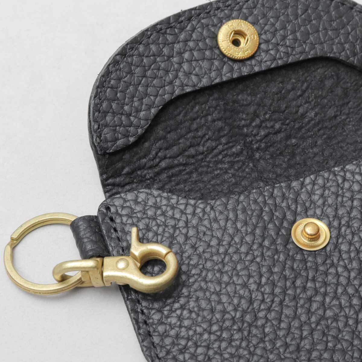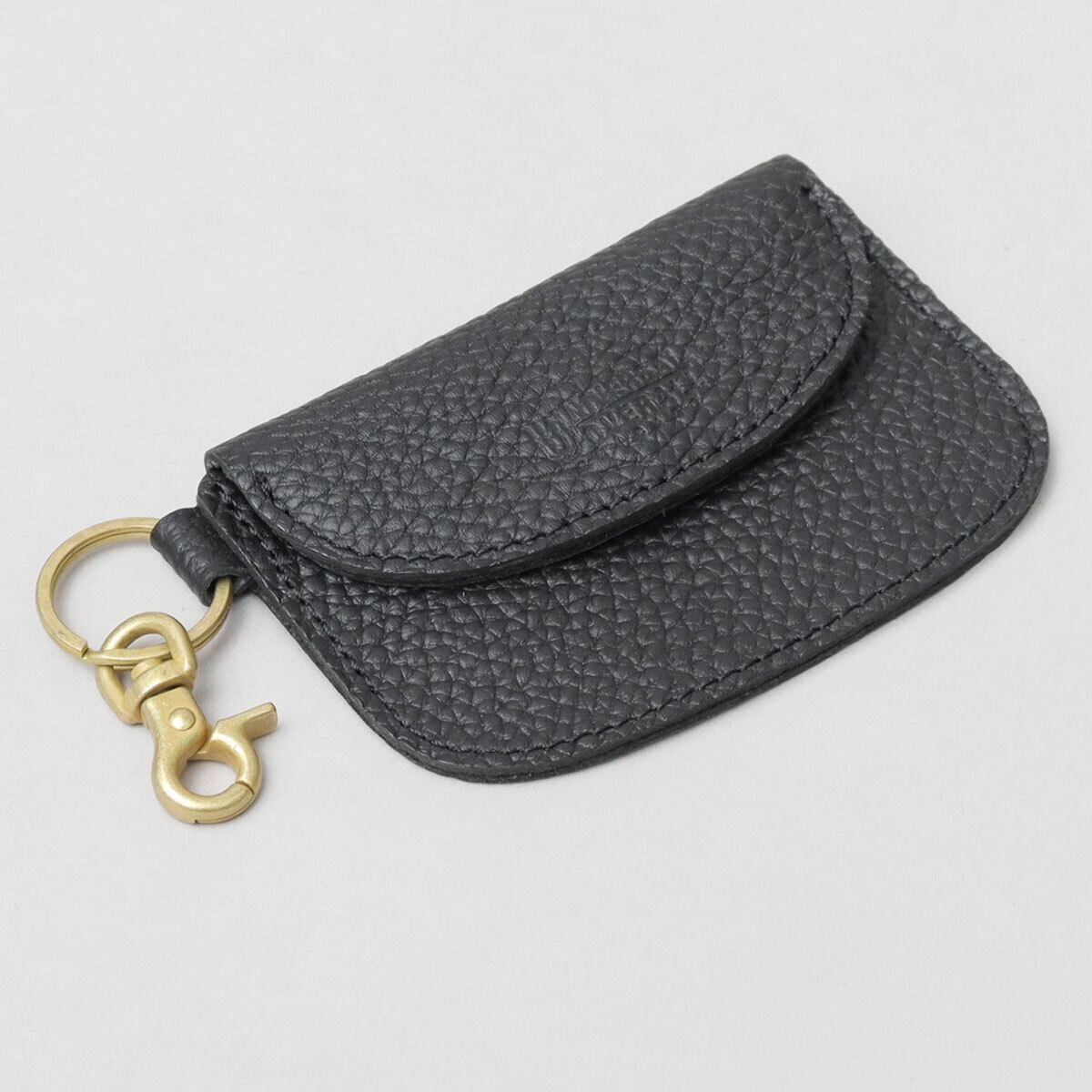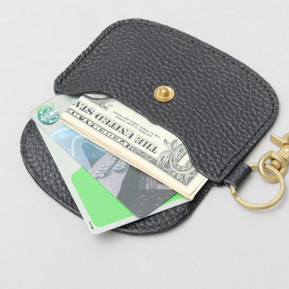 表情豊かなシボレザーを使用した、ワンカラーで飽きのこないシンプルデザインのカードケース。フロントのフラップに刻印されたブランドロゴがさり気ないアクセント。