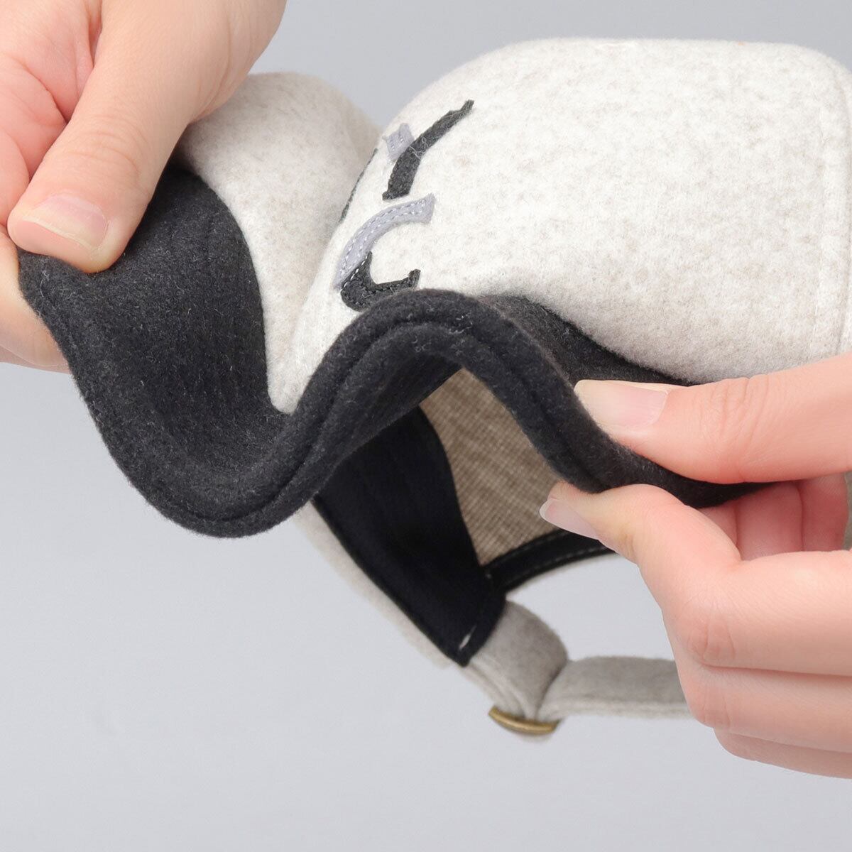 芯地のない柔らかなツバには、ソフトワイヤー入りで、ツバを曲げたり反らせたり表情を変えて楽しめる。ツバが邪魔にならないので後ろ被りもおすすめ。