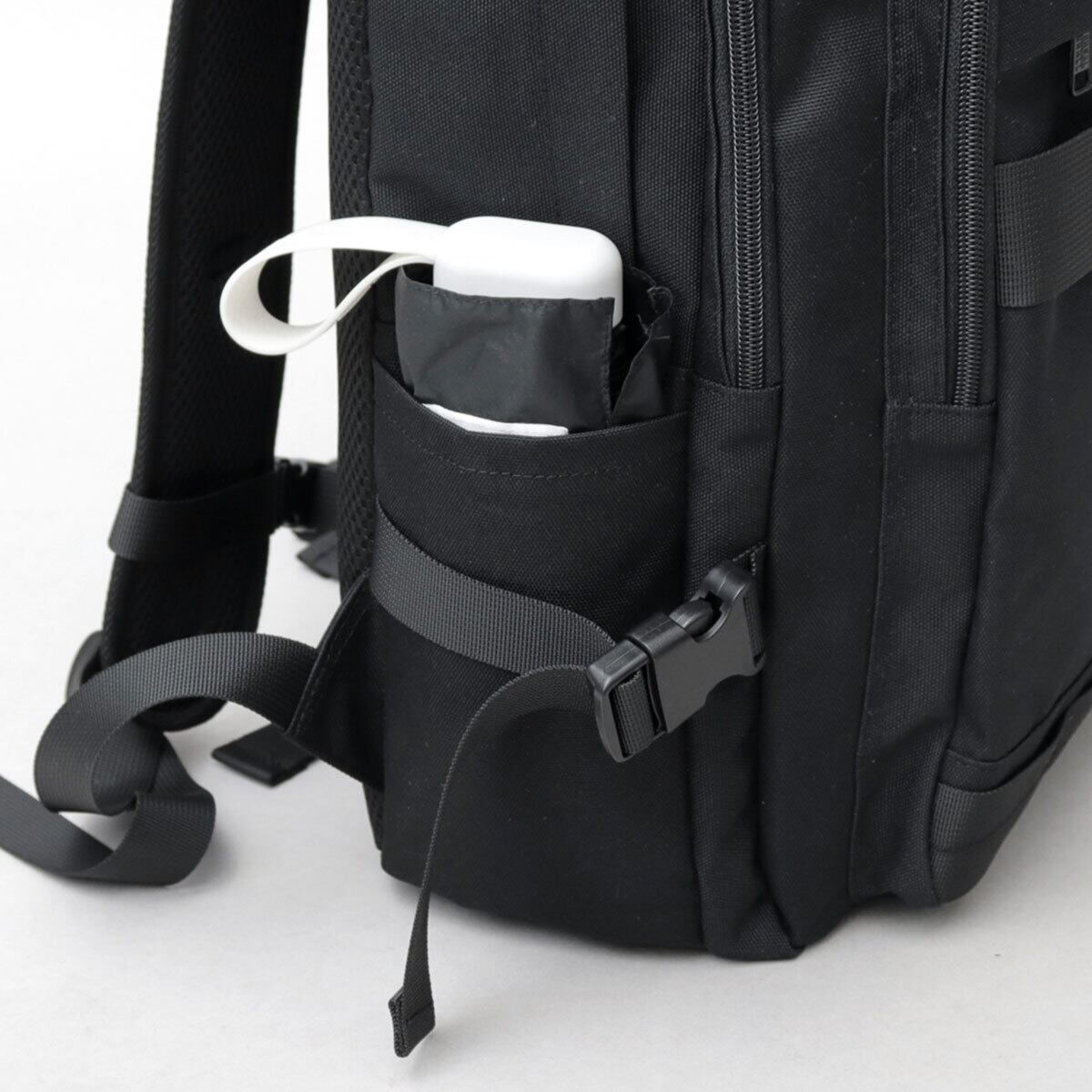 バッグの両サイドには、折り畳み傘やボトル類の収納に便利なオープンポケットを完備。