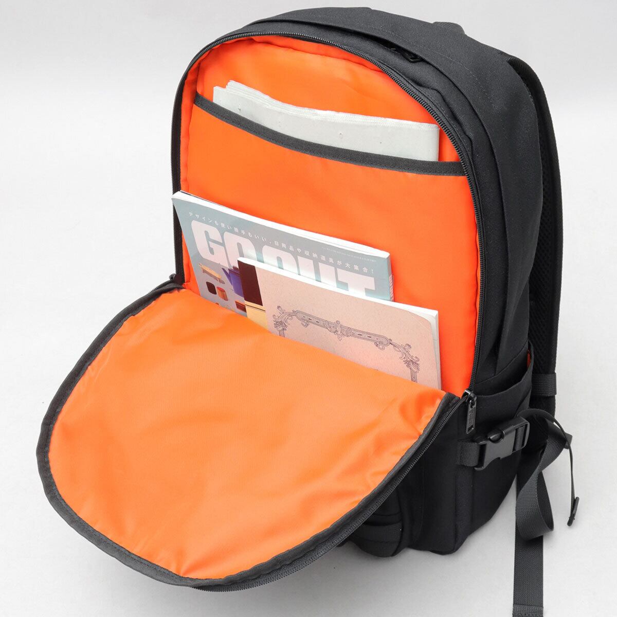 薄マチの収納スペース。ファイルや雑誌などの収納にピッタリ。内側にはオープンポケットを完備。