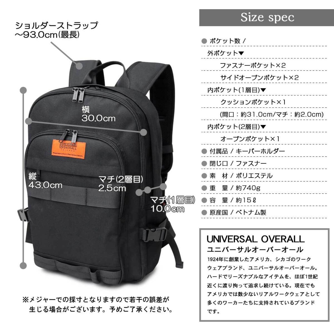 老舗ワークウェアブランド“ユニバーサルオーバーオール”のバックパック。大容量の2層式の収納スペースに加え、便利な収納ポケットを複数搭載した抜群の収納力!クッションポケットを備えているので、ノートパソコンなどの電子機器も安心して持ち運び可能。通勤・通学にも活躍してくれる便利なリュックサックです。普段使いにはもちろん、旅行、アウトドアにもオススメ!