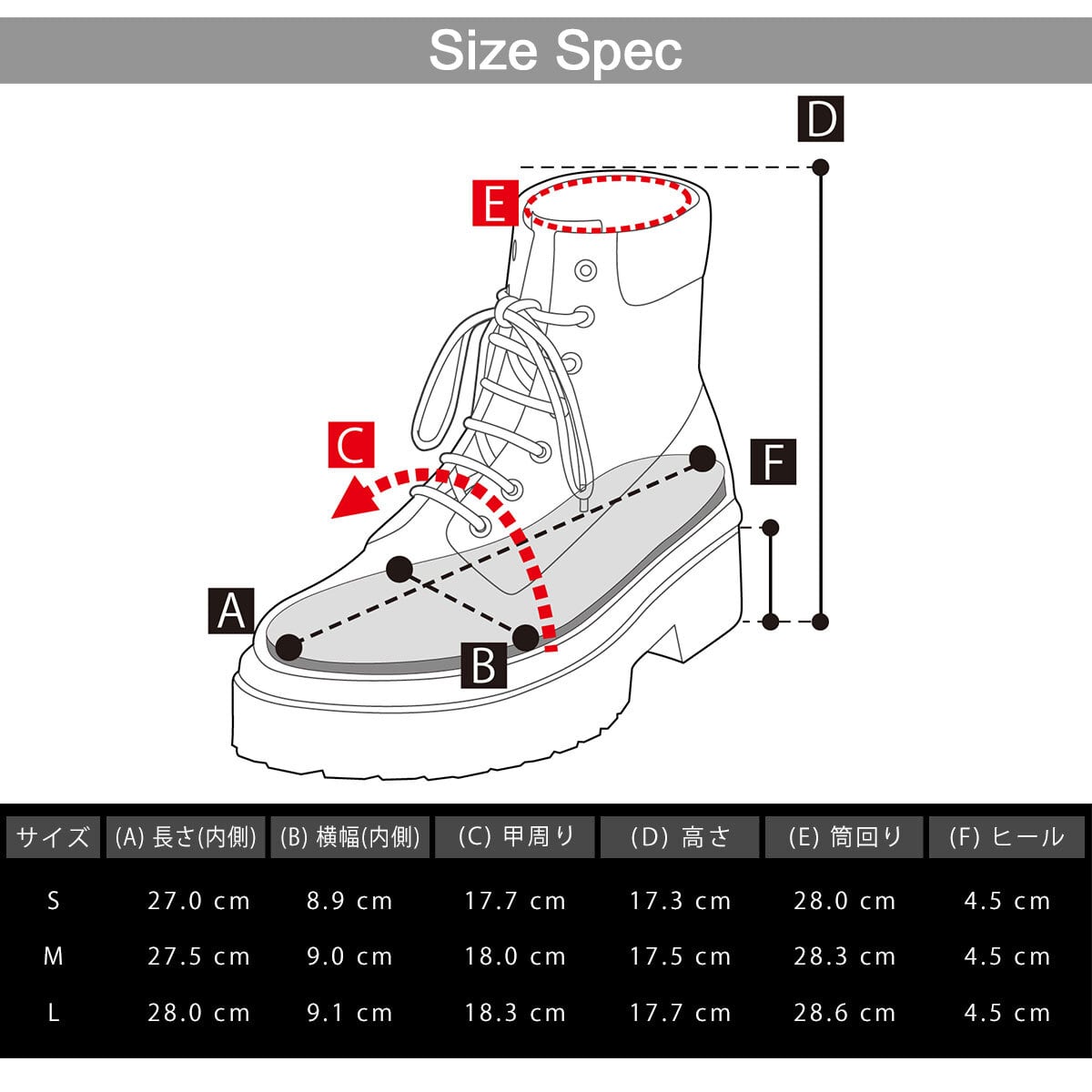 [L] 長さ:28.0cm/ 幅:9.1cm/ 甲周り:18.3cm/ 高さ:17.7cm/ 筒周り:28.6cm / ヒール:4.5cm/