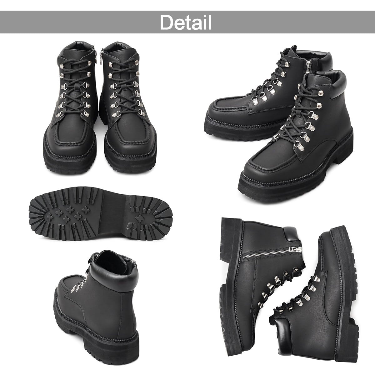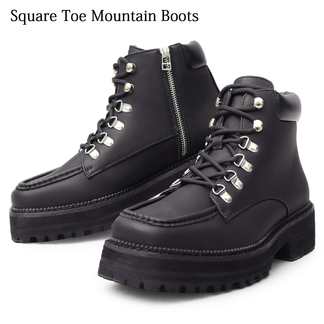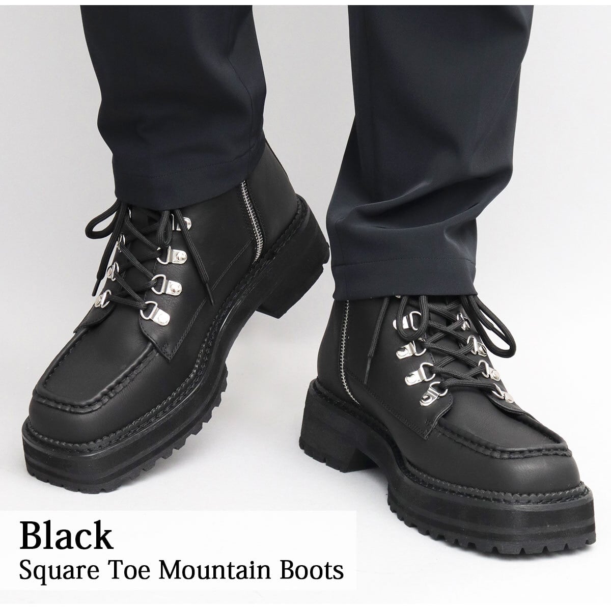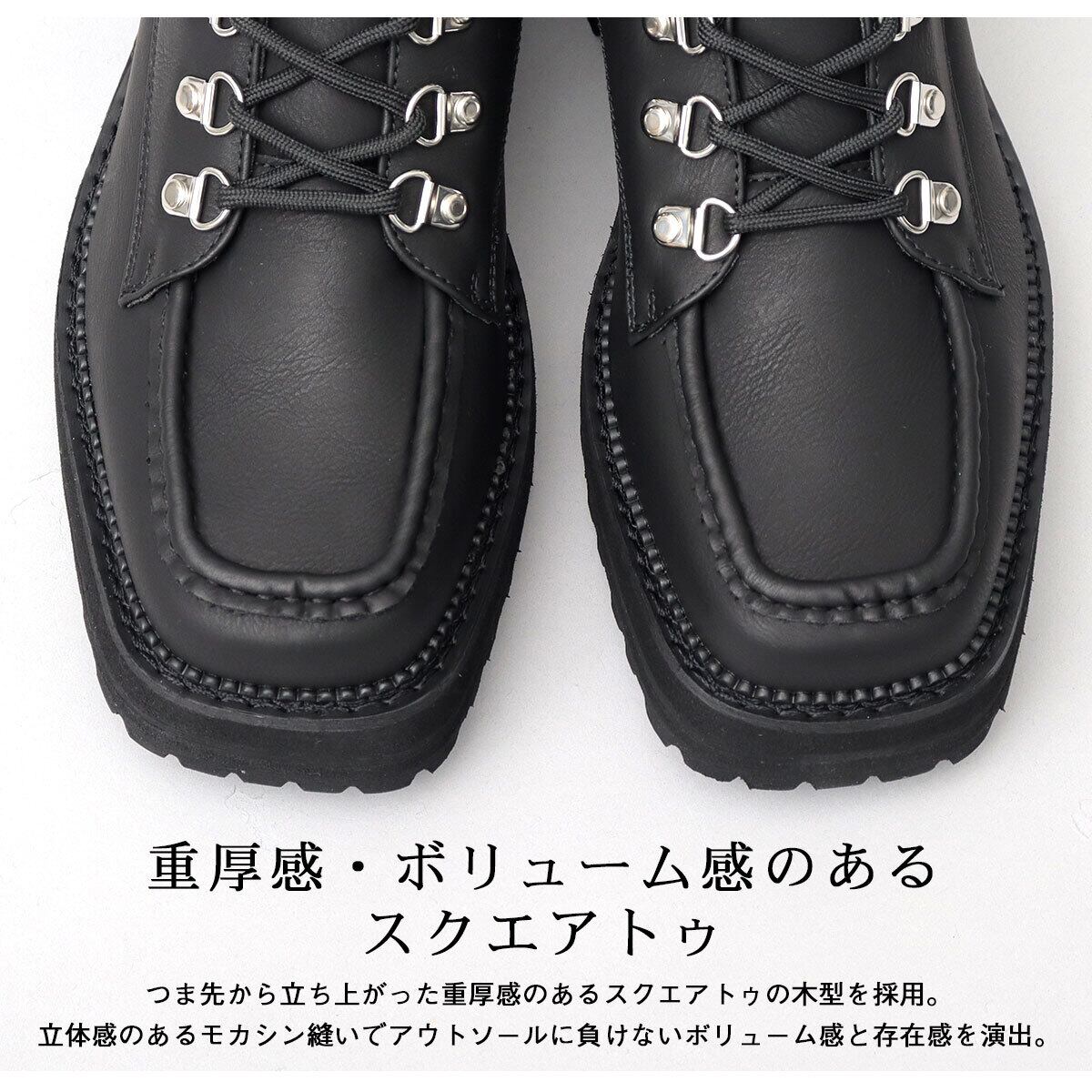 無骨なイメージのマウンテンブーツに、厚底ソールとスクエアトゥを合わせ、トレンド感のあるシルエットにアップデート。”今っぽい”モードなデザインのブーツに仕上げた。