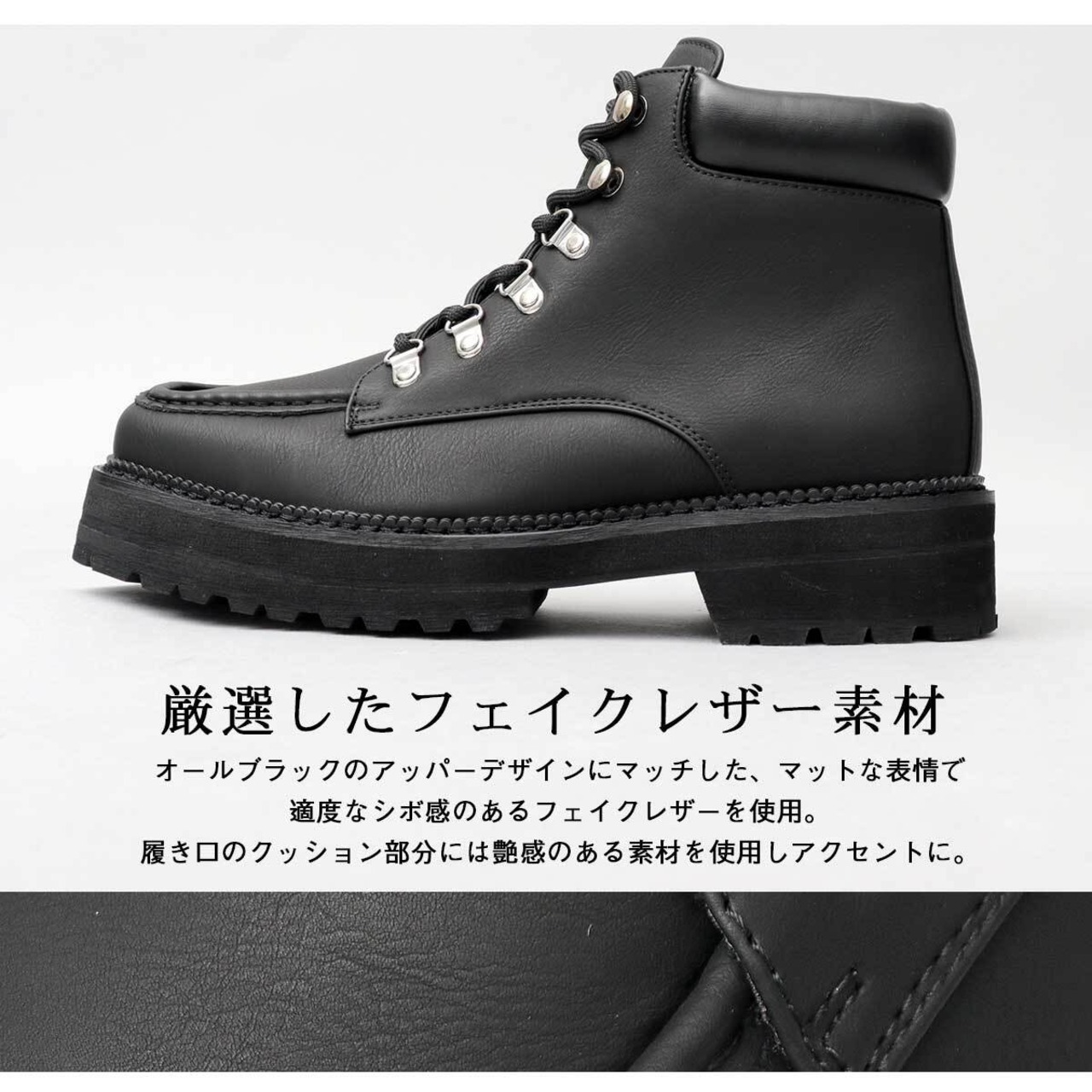 オールブラックのアッパーデザインにマッチした、マットな表情で適度なシボ感のあるフェイクレザーを使用。履き口のクッション部分には艶感のある素材を使用しアクセントに。