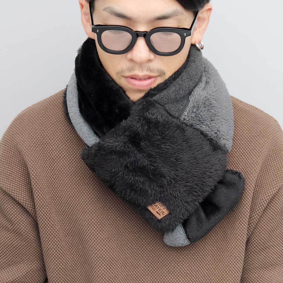 ボアやフリースなど、秋冬定番素材を同系色で組み合わせた中綿マフラー。温もり溢れる切り替えデザインがアウトドアな雰囲気。