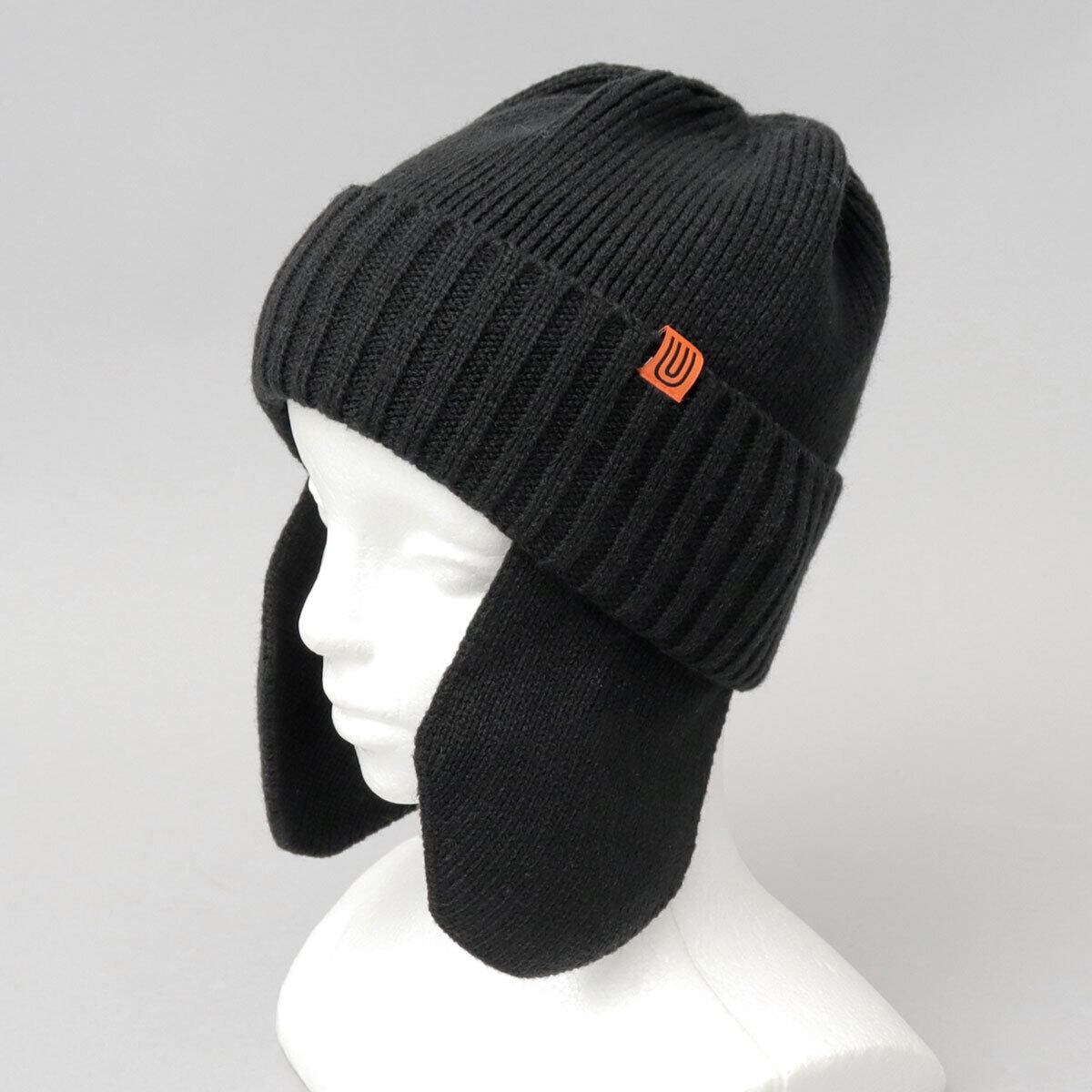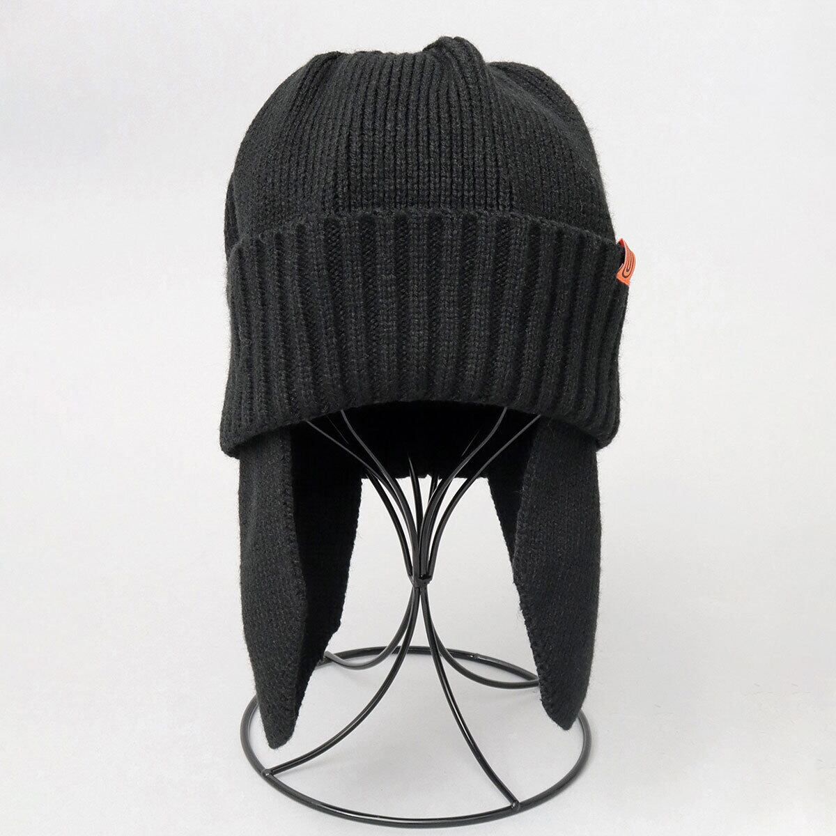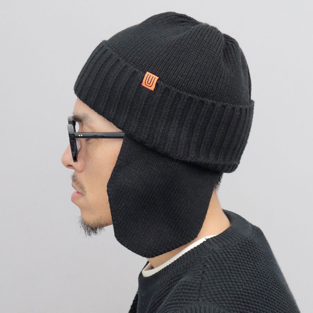 見た目も暖かな耳当て付きのニットキャップ。フロントのサイドに配置した、オレンジのアイコンタグがさり気ないアクセントに。